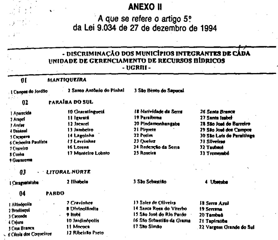 Artigo 5.º - Os Municípios integrantes de cada Unidade Hidrográfica de Gerenciamento de Recursos Hídricos — UGRHI estão relacionados no Anexo II.