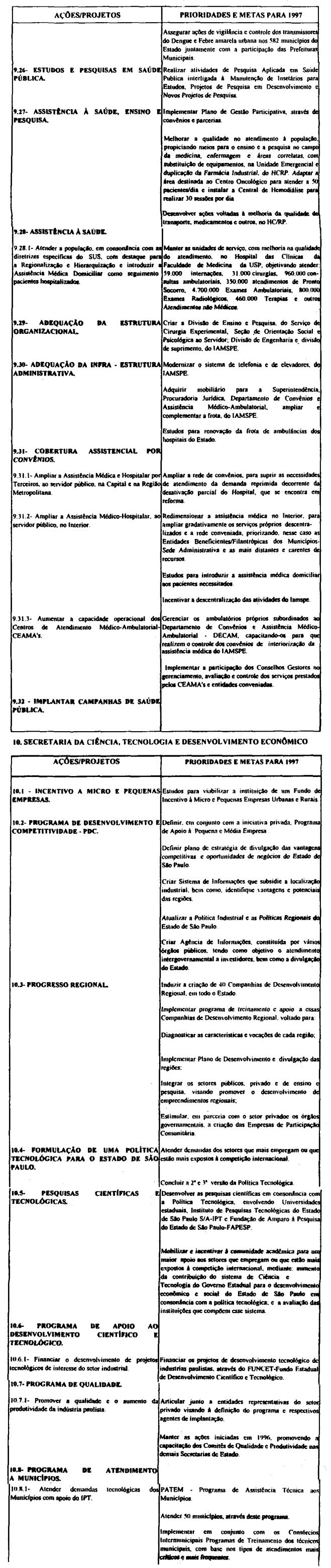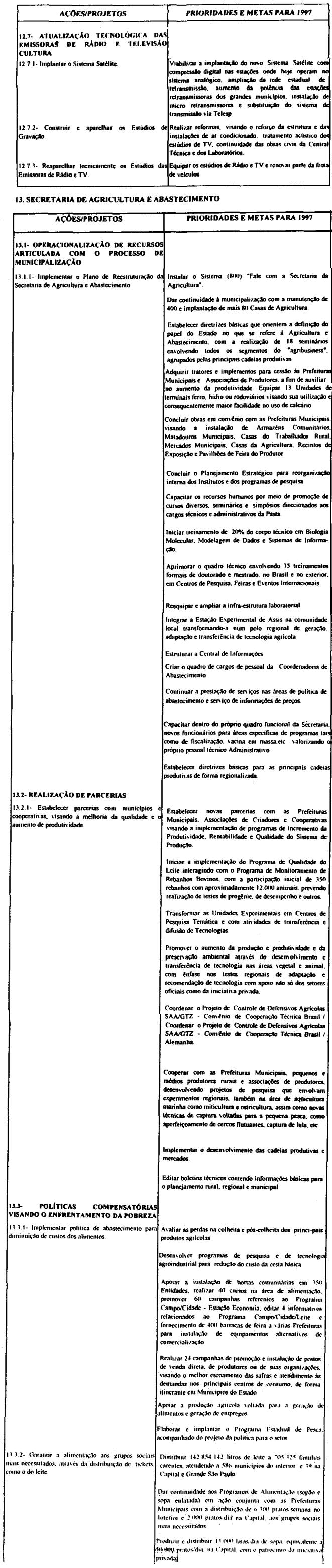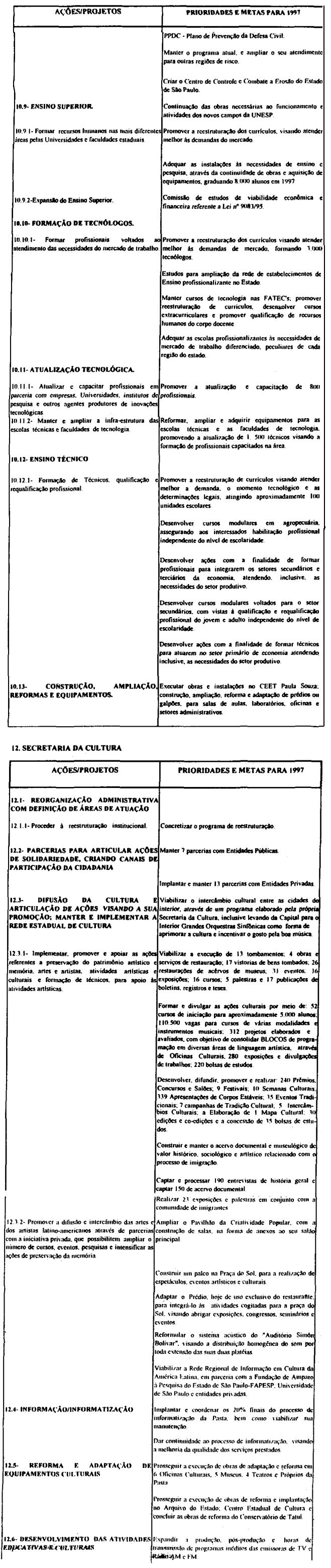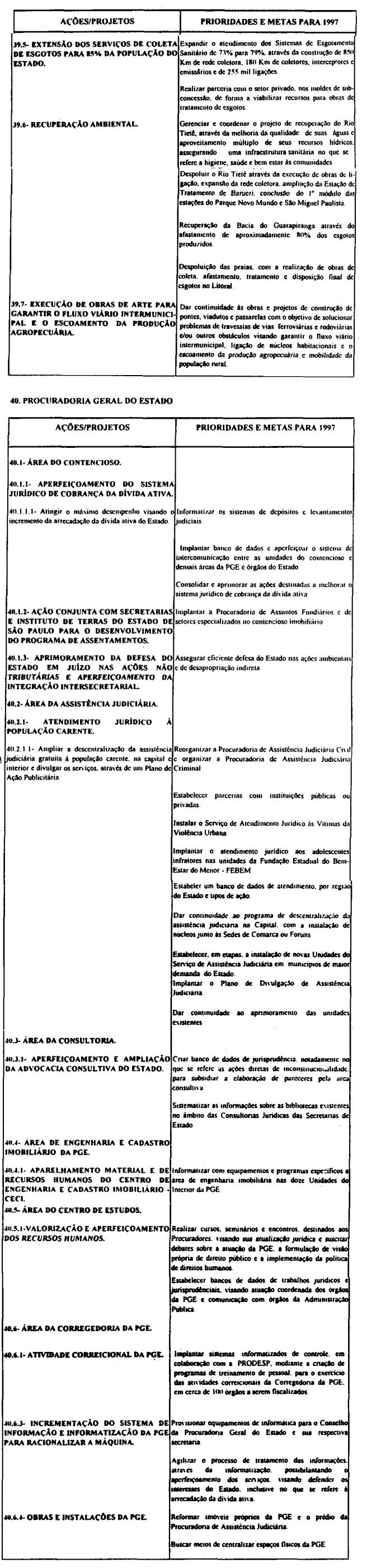 Artigo 10 - A proposta orçamentária do Estado para 1997 observará o que dispõe esta lei e será encaminhada pelo Poder Executivo à Assembléia Legislativa até 30 de setembro de 1996 contendo:I - mensagem;II - projeto de lei orçamentária; eIII - demonstrativo dos efeitos sobre as receitas e as despesas, de isentos, anistias, remissões, subsídios e benefícios de natureza financeira, tributária e creditícia.Artigo 11 - A mensagem que encaminhar o projeto de lei orçamentária anual deverá explicitar.I - as eventuais alterações, de qualquer natureza, e as respectivas justificativas, em relação às determinações contidas nesta lei;II - os critérios adotados para estimativa das fontes de recursos para o exercício;III - os recursos destinados à manutenção e ao desenvolvimento do ensino, na forma do disposto no Artigo 255 da Constituição do Estado;IV - a compatibilização das prioridades constantes da proposta orçamentária com as aprovadas nesta lei.Artigo 12 - Na ausência da lei complementar prevista no artigo 174, § 9°, itens 1 e 2 da constituição do Estado, integrarão a lei orçamentária anual, os seguintes demonstrativos;I - da receita por fonte e da despesa por categoria econômica e grupo de despesa, segundo os orçamentos;II - da despesa até o nível de atividade e de projeto, segundo os grupos de despesa, por órgão da administração direta, autarquia e fundação, e por unidade orçamentária, identificando as fontes de recursos:III - das receitas previstas para as fundações e as autarquias;IV - das dotações à conta do Tesouro, destinadas à transferências para as sociedades em que o Estado detenha, direta ou indiretamente, a maioria do capital social com direito a voto.Artigo 13 - A fixação das despesas de pessoal e seus encargos, deverá observar o disposto na Lei Complementar federal n. 82, de 27 de março de 1995.Artigo 14 - O orçamento de investimentos das sociedades em que o Estado detenha diretamente ou indiretamente a maioria do capital social com direito a voto deverá orientar-se pelas disposições desta lei e compreenderá as ações destinadas a:I - planejamento, gerenciamento e execução de obras;II - aquisição de imóveis ou bens de capital;III - aquisição de instalações, equipamentos e material permanente.Parágrafo único - O orçamento que trata este artigo conterá:1 - demonstrativo geral contendo o valor global do investimento por sociedade em que o Estado detenha, direta ou indiretamente, a maioria do capital social com direito a voto e os valores das suas fontes de recursos; 2 - demonstrativo geral contendo os valores dos investimentos por função e as respectivas fontes de recursos;3 - demonstrativo específico dos investimentos por sociedade em que o estado detenha, direta ou indiretamente, a maioria do capital social com direito a voto, contendo os valores por projeto e as respectivas fontes de recursos;4 - descrição específica por sociedade em que o Estado detenha, direta ou indiretamente, a maioria do capital social com direito a voto, contendo a respectiva base legal de constituição, a indicação do órgão ao qual está vinculada e sua composição acionária.Artigo 15 - Os recursos à conta do Tesouro do Estado destinados às sociedades em que o Estado detenha, direta ou indiretamente, a maioria do capital social com direito a voto, serão previstos no orçamento fiscal sob as formas de subscrição de ações, contribuição corrente e subvenção econômica.§ 1° - Os recursos do Tesouro do Estado repassados às sociedades em que o Estado detenha, direta ou indiretamente, a maioria do capital social com direito a voto sob a forma de subscrição de ações serão destinados às despesas de investimento e serviço da dívida.§ 2° - Os recursos do Tesouro do Estado repassados às sociedades em que o Estado detenha, direta ou indiretamente, a maioria do capital social com direito a voto sob forma de contribuição corrente serão destinados à complementação de benefícios referentes ao pagamento de proventos a inativos e pensionistas, beneficiados pelas Leis n. 4.819, de 26 de agosto de 1958 e n. 200, de 13 de maio de 1974.§ 3° - Os recursos do Tesouro do Estado repassados às sociedades em que o Estado detenha, direta ou indiretamente, a maioria do capital social com direito a voto sob a forma de subvenção econômica serão destinados à cobertura de despesas de custeio.Artigo 16 - As despesas com publicidade deverão ser destacadas na apresentação funcional-programática de cada órgão, sob denominação que permita sua clara identificação.Artigo 17 - Os créditos suplementares abertos por decreto do Executivo, quando destinados a suprir insuficiências nas dotações orçamentárias, relativos a inativos e pensionistas, honras de aval, débitos constantes de precatórios judiciais, despesas de exercícios anteriores despesa à conta de recursos vinculados, não onerarão o limite autorizado na lei orçamentária.Artigo 18 - O processo de elaboração da lei orçamentária para 1997 contará com participação popular, devendo o Governador do Estado promover audiências públicas com todas as regiões administrativas do Estado de São Paulo.Parágrafo único - A audiências serão realizadas em datas e critérios estabelecidos pelo Poder Executivo.
