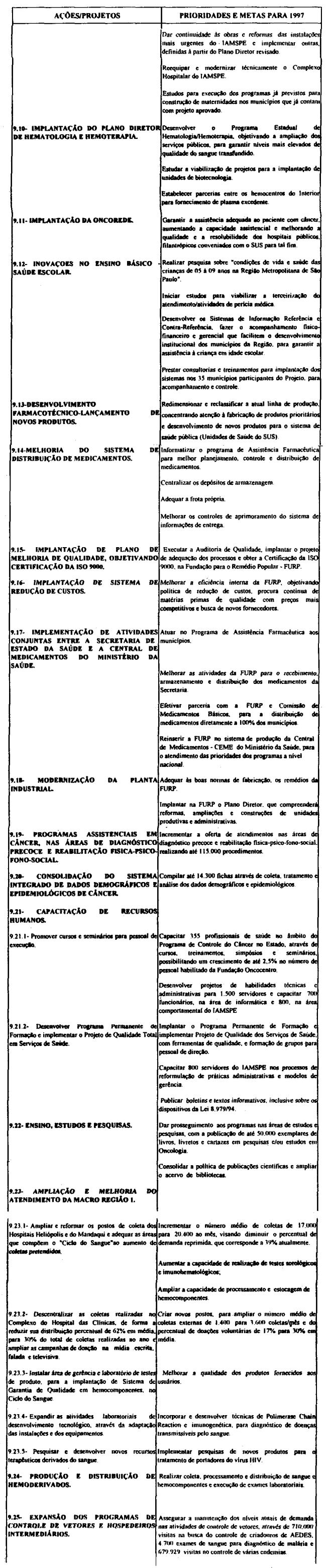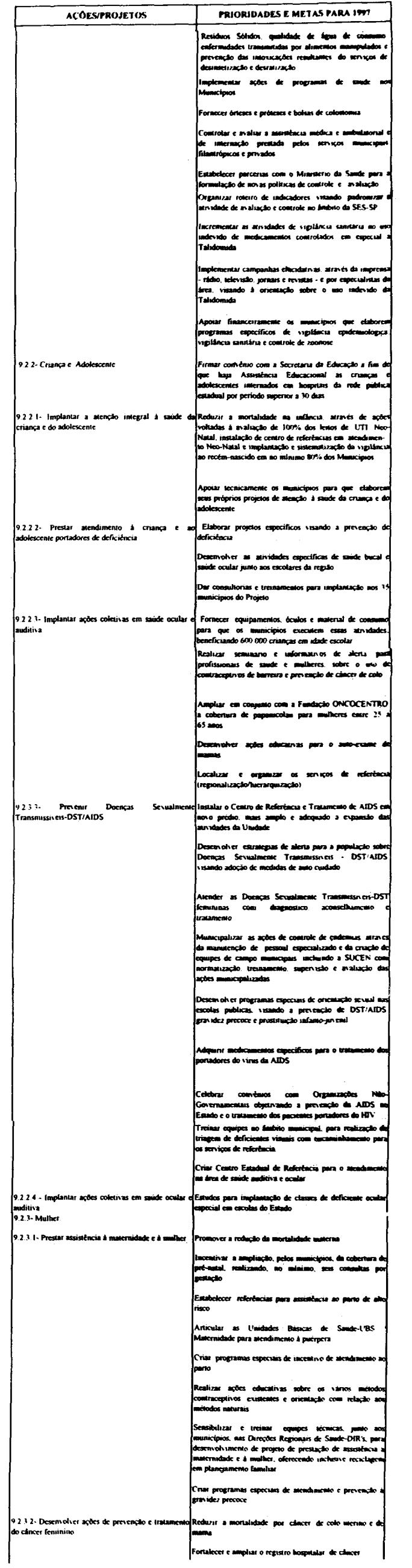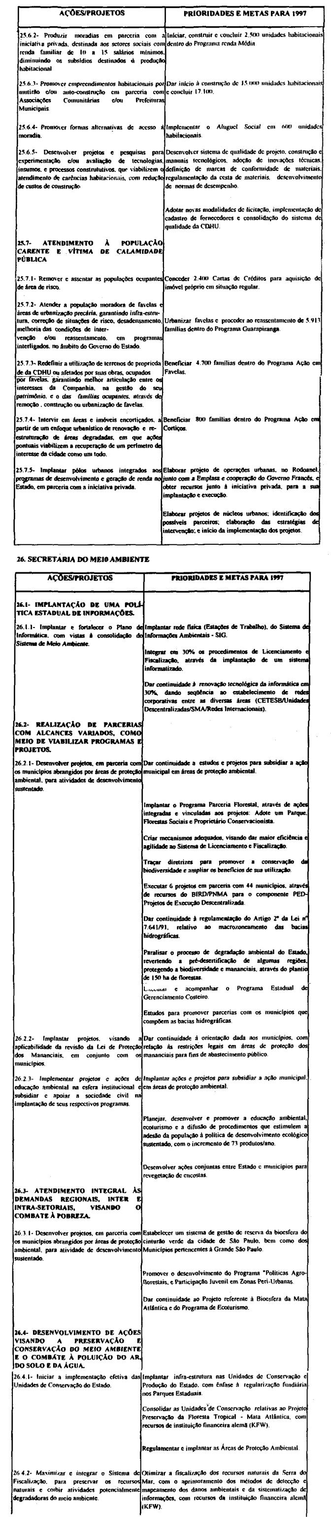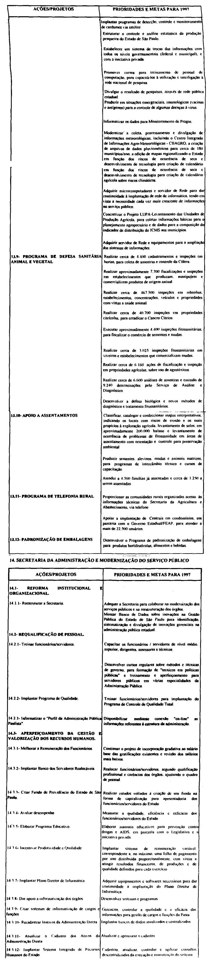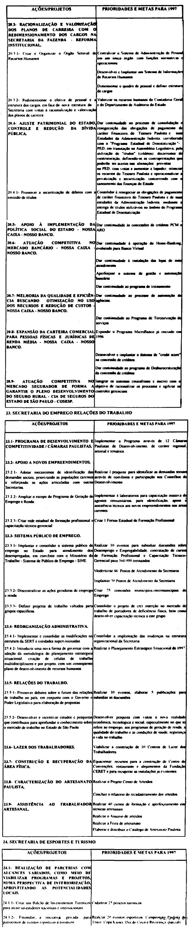 Artigo 10 - A proposta orçamentária do Estado para 1997 observará o que dispõe esta lei e será encaminhada pelo Poder Executivo à Assembléia Legislativa até 30 de setembro de 1996 contendo:I - mensagem;II - projeto de lei orçamentária; eIII - demonstrativo dos efeitos sobre as receitas e as despesas, de isentos, anistias, remissões, subsídios e benefícios de natureza financeira, tributária e creditícia.Artigo 11 - A mensagem que encaminhar o projeto de lei orçamentária anual deverá explicitar.I - as eventuais alterações, de qualquer natureza, e as respectivas justificativas, em relação às determinações contidas nesta lei;II - os critérios adotados para estimativa das fontes de recursos para o exercício;III - os recursos destinados à manutenção e ao desenvolvimento do ensino, na forma do disposto no Artigo 255 da Constituição do Estado;IV - a compatibilização das prioridades constantes da proposta orçamentária com as aprovadas nesta lei.Artigo 12 - Na ausência da lei complementar prevista no artigo 174, § 9°, itens 1 e 2 da constituição do Estado, integrarão a lei orçamentária anual, os seguintes demonstrativos;I - da receita por fonte e da despesa por categoria econômica e grupo de despesa, segundo os orçamentos;II - da despesa até o nível de atividade e de projeto, segundo os grupos de despesa, por órgão da administração direta, autarquia e fundação, e por unidade orçamentária, identificando as fontes de recursos:III - das receitas previstas para as fundações e as autarquias;IV - das dotações à conta do Tesouro, destinadas à transferências para as sociedades em que o Estado detenha, direta ou indiretamente, a maioria do capital social com direito a voto.Artigo 13 - A fixação das despesas de pessoal e seus encargos, deverá observar o disposto na Lei Complementar federal n. 82, de 27 de março de 1995.Artigo 14 - O orçamento de investimentos das sociedades em que o Estado detenha diretamente ou indiretamente a maioria do capital social com direito a voto deverá orientar-se pelas disposições desta lei e compreenderá as ações destinadas a:I - planejamento, gerenciamento e execução de obras;II - aquisição de imóveis ou bens de capital;III - aquisição de instalações, equipamentos e material permanente.Parágrafo único - O orçamento que trata este artigo conterá:1 - demonstrativo geral contendo o valor global do investimento por sociedade em que o Estado detenha, direta ou indiretamente, a maioria do capital social com direito a voto e os valores das suas fontes de recursos; 2 - demonstrativo geral contendo os valores dos investimentos por função e as respectivas fontes de recursos;3 - demonstrativo específico dos investimentos por sociedade em que o estado detenha, direta ou indiretamente, a maioria do capital social com direito a voto, contendo os valores por projeto e as respectivas fontes de recursos;4 - descrição específica por sociedade em que o Estado detenha, direta ou indiretamente, a maioria do capital social com direito a voto, contendo a respectiva base legal de constituição, a indicação do órgão ao qual está vinculada e sua composição acionária.Artigo 15 - Os recursos à conta do Tesouro do Estado destinados às sociedades em que o Estado detenha, direta ou indiretamente, a maioria do capital social com direito a voto, serão previstos no orçamento fiscal sob as formas de subscrição de ações, contribuição corrente e subvenção econômica.§ 1° - Os recursos do Tesouro do Estado repassados às sociedades em que o Estado detenha, direta ou indiretamente, a maioria do capital social com direito a voto sob a forma de subscrição de ações serão destinados às despesas de investimento e serviço da dívida.§ 2° - Os recursos do Tesouro do Estado repassados às sociedades em que o Estado detenha, direta ou indiretamente, a maioria do capital social com direito a voto sob forma de contribuição corrente serão destinados à complementação de benefícios referentes ao pagamento de proventos a inativos e pensionistas, beneficiados pelas Leis n. 4.819, de 26 de agosto de 1958 e n. 200, de 13 de maio de 1974.§ 3° - Os recursos do Tesouro do Estado repassados às sociedades em que o Estado detenha, direta ou indiretamente, a maioria do capital social com direito a voto sob a forma de subvenção econômica serão destinados à cobertura de despesas de custeio.Artigo 16 - As despesas com publicidade deverão ser destacadas na apresentação funcional-programática de cada órgão, sob denominação que permita sua clara identificação.Artigo 17 - Os créditos suplementares abertos por decreto do Executivo, quando destinados a suprir insuficiências nas dotações orçamentárias, relativos a inativos e pensionistas, honras de aval, débitos constantes de precatórios judiciais, despesas de exercícios anteriores despesa à conta de recursos vinculados, não onerarão o limite autorizado na lei orçamentária.Artigo 18 - O processo de elaboração da lei orçamentária para 1997 contará com participação popular, devendo o Governador do Estado promover audiências públicas com todas as regiões administrativas do Estado de São Paulo.Parágrafo único - A audiências serão realizadas em datas e critérios estabelecidos pelo Poder Executivo.