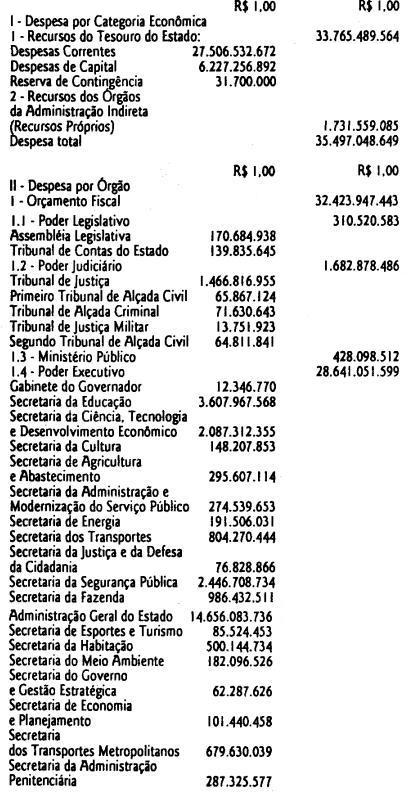 Artigo 4º - A Despesa Total, no mesmo valor da Receita Total, é fixada em R$ 35.497.048.649,00 (trinta e cinco bilhões, quatrocentos e noventa e sete milhões, quarenta e oito mil, seiscentos e quarenta e nove reais):