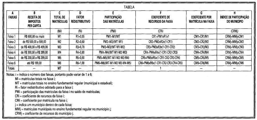 4 - para cada faixa será calculado um coeficiente de recursos que determinará o montante total de recursos destinado ao conjunto dos municípios da faixa; o coeficiente de recursos da primeira faixa, será calculado pela aplicação do fator redistributivo sobre a proporção das matrículas daquela faixa nas matrículas totais; para as demais faixas, cálculo análogo será efetuado, devendo, dos totais de matrículas e de recursos a serem considerados, ser descontados os montantes já atribuídos às faixas anteriores, conforme coluna E e F da Tabela anexa a esta lei;
