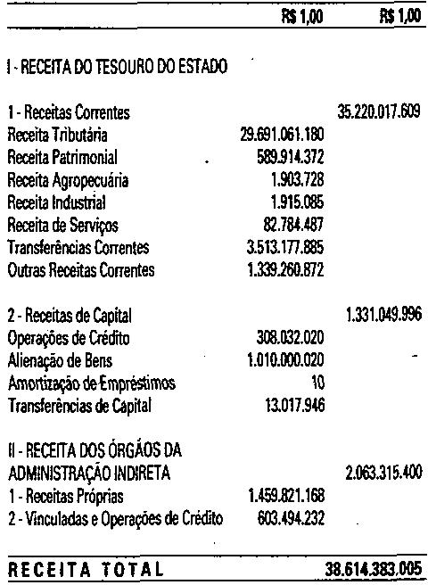 Artigo 2º - A Receita Total e orçada e a Despesa Total fixada em valores iguais a R$ 38.614.383.005,00 (trinta e oito bilhões, seiscentos e quatorze milhões, trezentos e oitenta e três mil e cinco reais).