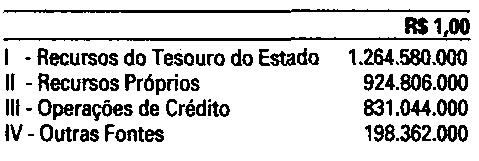 Artigo 6º - A despesa do Orçamento de Investimentos das Empresas e fixada em R$ 3.218.792.000,00 (três bilhões, duzentos e dezoito milhões e setecentos e noventa e dois mil reais), contando com as seguintes fontes de financiamento: