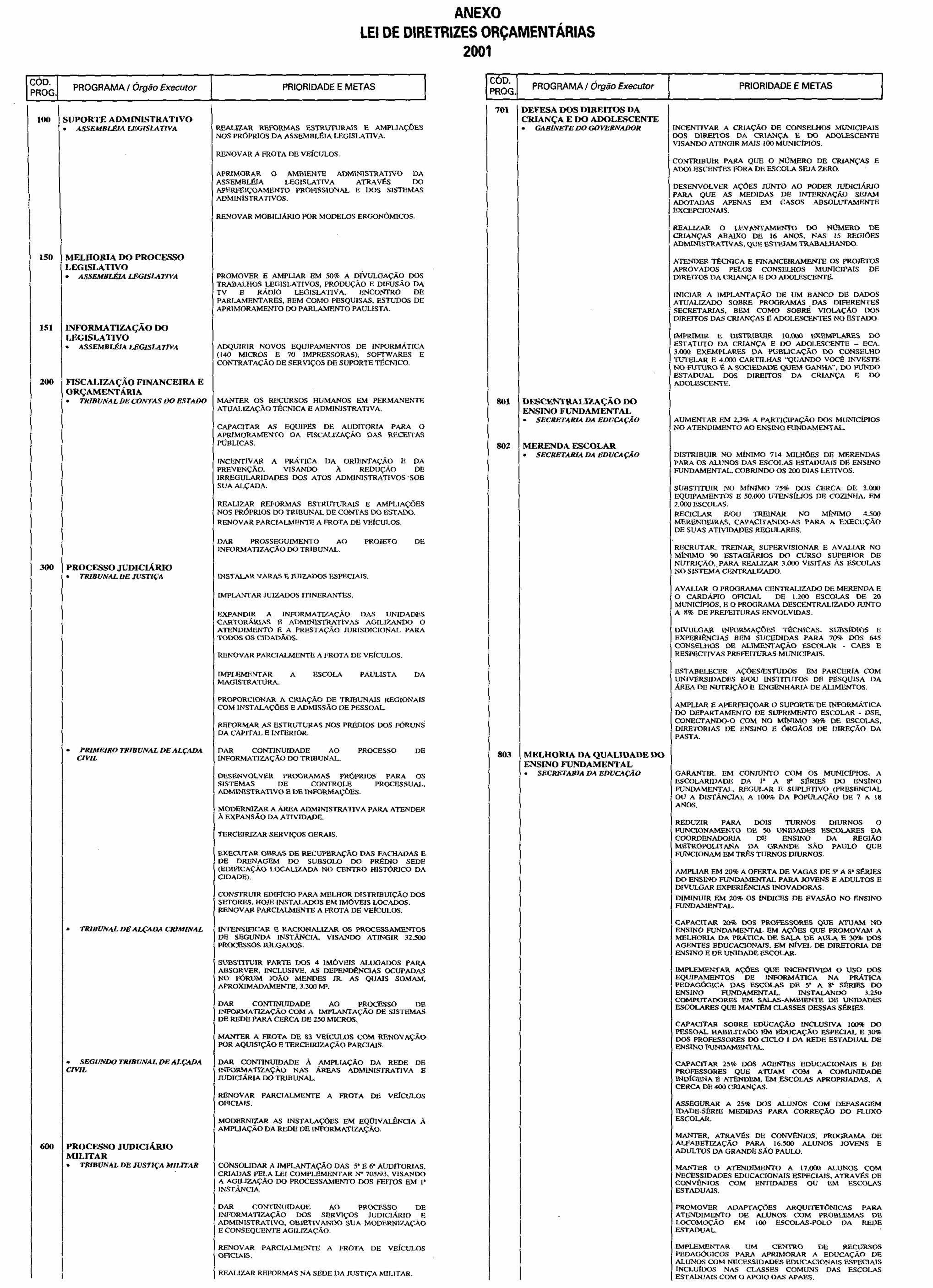 Artigo 12. - A proposta orçamentária do Estado para 2001 observará o que dispõe esta lei e será encaminhada pelo Poder Executivo à Assembléia Legislativa até 30 de setembro de 2000, contendo: