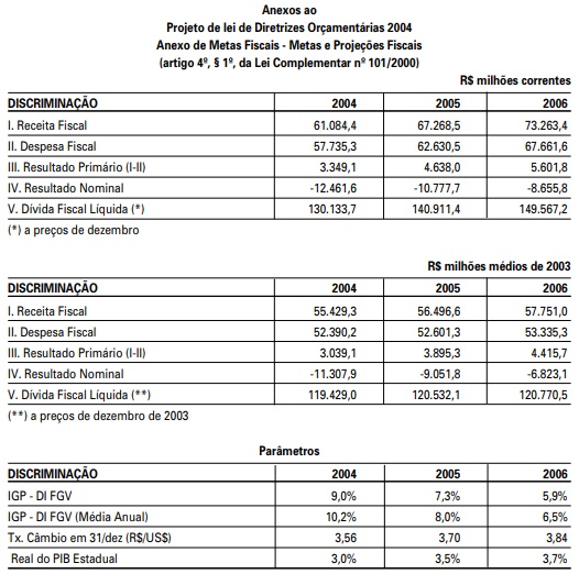 Artigo 10 - A proposta orçamentária do Estado para 2004 será encaminhada pelo Poder Executivo à Assembléia Legislativa até 30 de setembro de 2003, contendo: