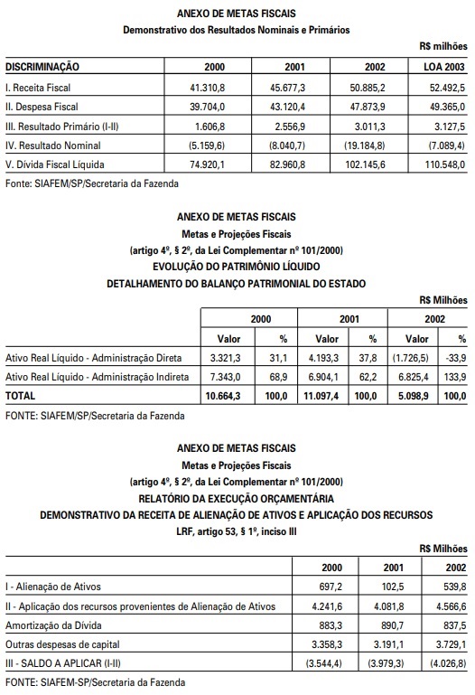 O Estado de São Paulo, muito antes do advento da Lei de Responsabilidade Fiscal, já havia avançado bastante na direção de um regime fiscal responsável. As mudanças institucionais visando ao equilíbrio fiscal de longo prazo vêm desde meados de 1995, com o início da gestão Mário Covas, cujas metas têm sido cumpridas com razoável sucesso.