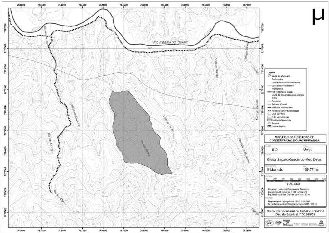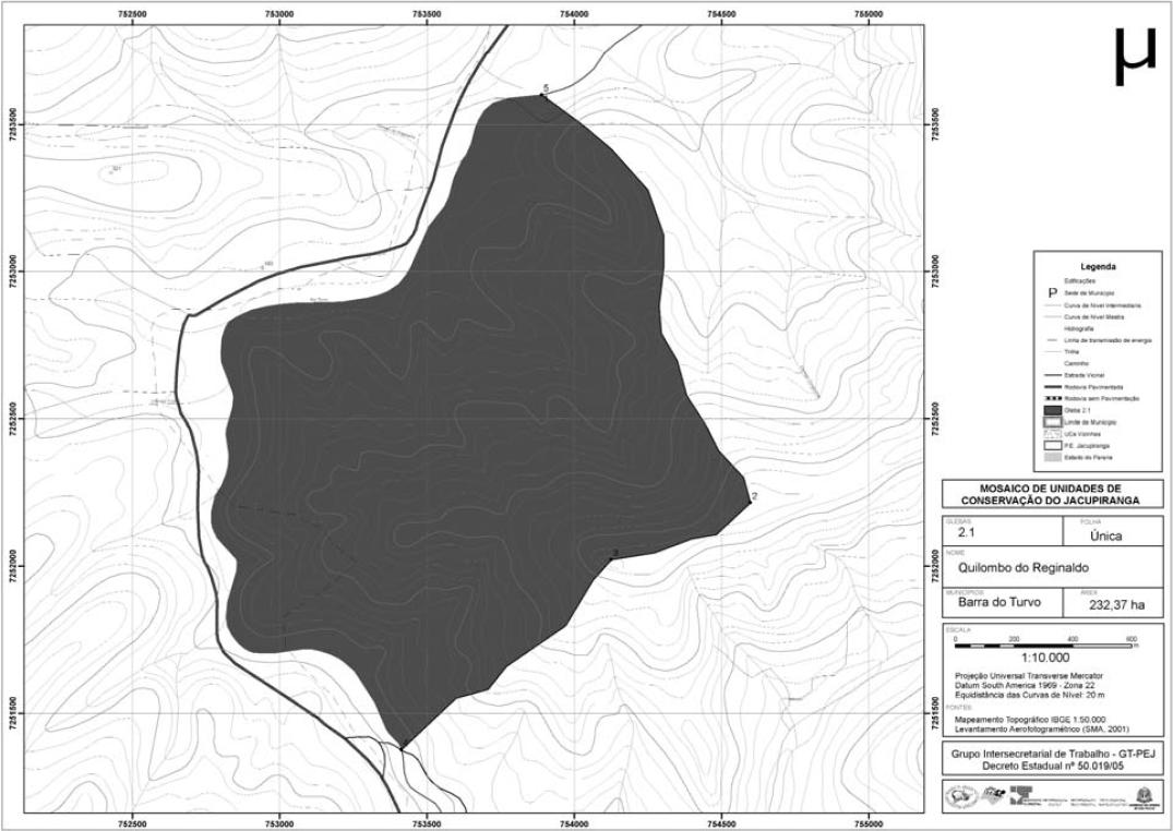 § 2º - Na área de abrangência da APA dos Quilombos do Médio Ribeira, ficam também reservados 169,77 ha (cento e sessenta e nove hectares e setenta e sete ares), área conhecida como Sapatú/Queda de Meu Deus, conforme gleba 5.2 descrita no memorial descritivo no Anexo 17, para os estudos necessários à efetivação do compromisso da Associação de Remanescentes de Quilombos do Bairro de Sapatu, firmado com a Fundação Florestal, de instituir uma Reserva Particular do Patrimônio Natural - RPPN, a qual irá compor o Mosaico do Jacupiranga.