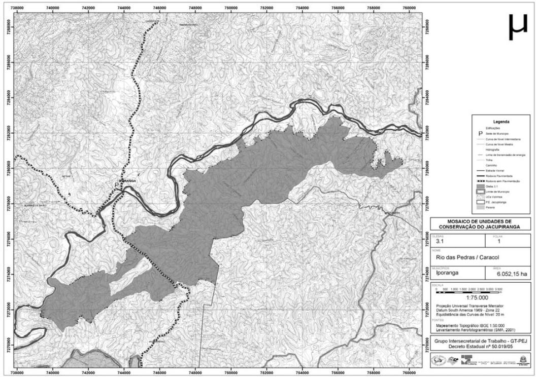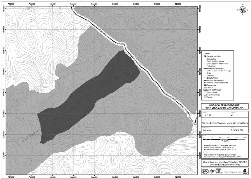 I - gleba nº 3.1, conhecida como Rio das Pedras/Caracol, no Município de Iporanga, com área de 6.052,15 ha (seis mil e cinqüenta e dois hectares e quinze ares), com exceção da estrada de ligação entre Iporanga e Barra do Turvo e com exclusão da área da cascalheira municipal e respectivo acesso pela estrada de ligação entre os dois Municípios, descrita e caracterizada como gleba 3.1. A, com 170,62 ha (cento e setenta hectares e sessenta e dois ares);