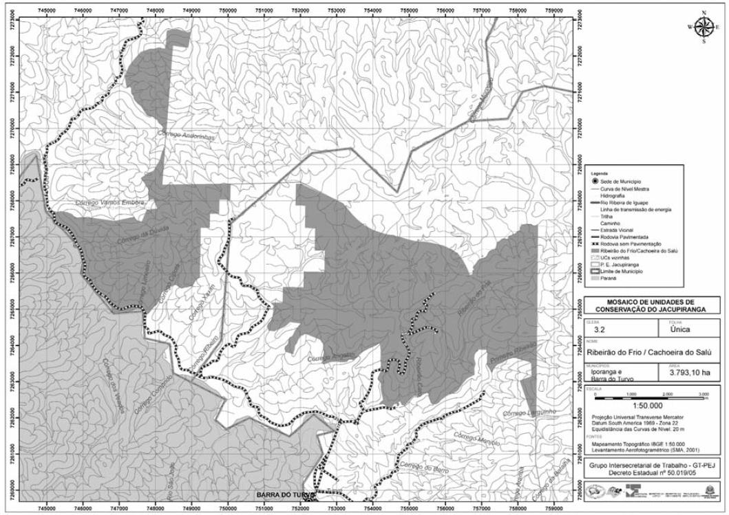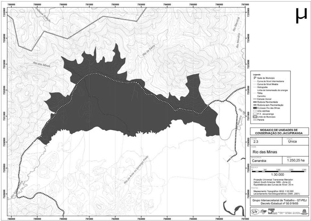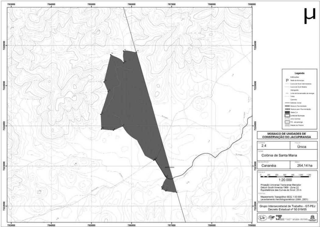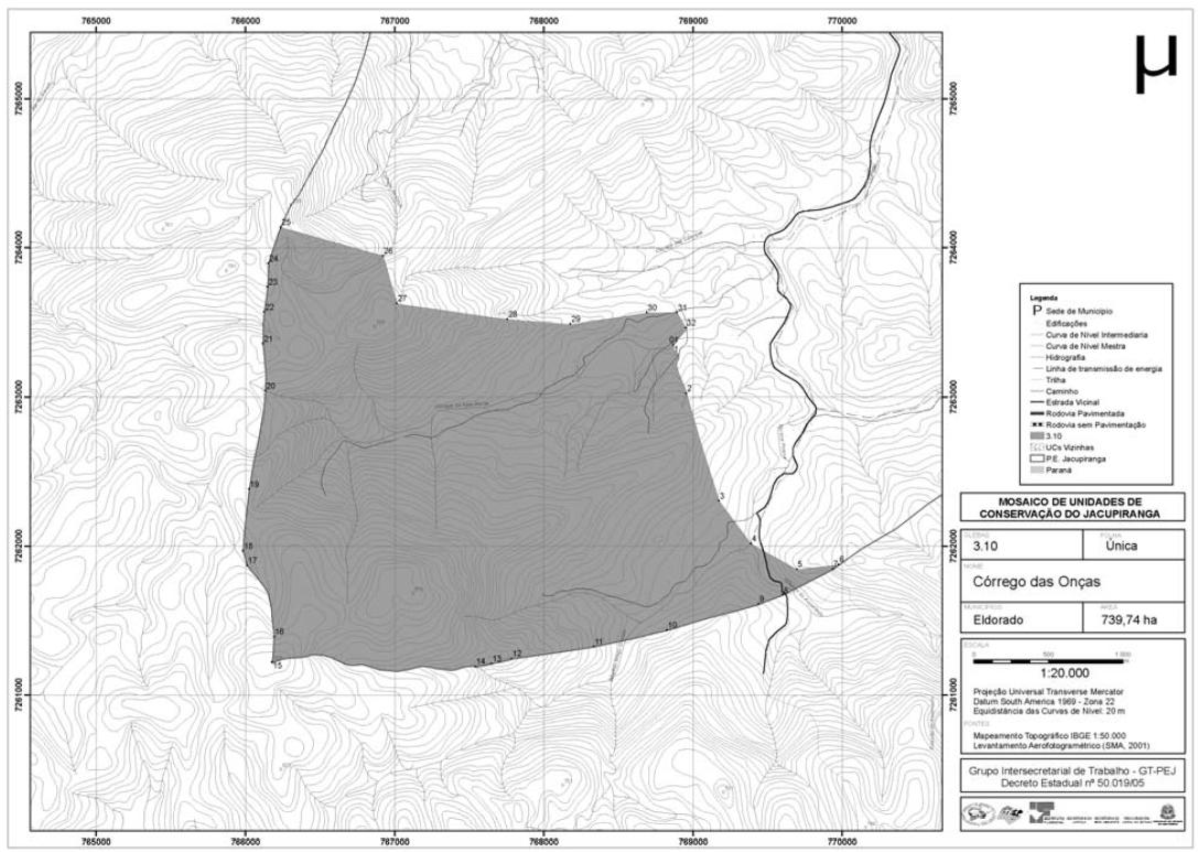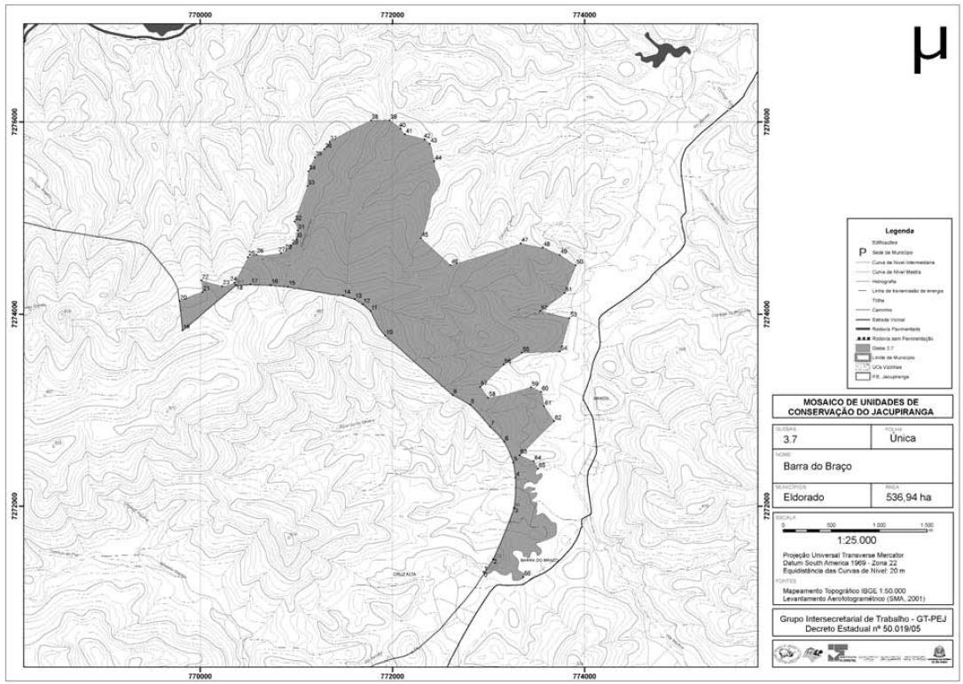 Do vértice 1 ,segue pela antiga divisa do Parque Estadual do Jacupiranga até o vértice 2,de coordenadas E=782.555,6947 m e N= 7.248.867,2423 m, do vértice 2 ,segue até o vértice 3,de coordenadas E= 782.530,7883 m e N=7.248.861,1994 m, do vértice 3 ,segue até o vértice 4,de coordenadas E= 782.530,7883 m e N= 7.248.715,0406 m, do vértice 4 ,segue até o vértice 5,de coordenadas E= 782.501,9411 m e N= 7.248.688,1166 m, do vértice 5 ,segue até o vértice 6,de coordenadas E= 782.498,0948 m e N= 7.248.653,5000 m, do vértice 6 ,segue até o vértice 7,de coordenadas E=782.463,4783 m e N= 7.248.626,5760 m, do vértice 7 ,segue até o vértice 8,de coordenadas E= 782.436,5543 m e N=7.248.595,8057 m, do vértice 8 ,segue até o vértice 9,de coordenadas E= 782.407,7071 m e N= 7.248.588,1131 m, do vértice 9 ,segue até o vértice 10,de coordenadas E= 782.409,6303 m e N= 7.248.641,9611 m, do vértice 10 ,segue até o vértice 11,de coordenadas E= 782.400,0146 m e N= 7.248.641,9611 m, do vértice 11 ,segue até o vértice 12,de coordenadas E=782.346,1666 m e N= 7.248.595,8057 m, do vértice 12 ,segue até o vértice 13,de coordenadas E= 782.284,6260 m e N=7.248.595,8057 m, do vértice 13 ,segue até o vértice 14,de coordenadas E= 782.271,1640 m e N= 7.248.615,0371 m, do vértice 14 ,segue até o vértice 15,de coordenadas E=782.255,7788 m e N= 7.248.605,4214 m, do vértice 15 ,segue até o vértice 16,de coordenadas E= 782.271,1640 m e N=7.248.586,1900 m, do vértice 16, segue até o vértice 17,de coordenadas E= 782.275,0103 m e N= 7.248.563,1123 m, do vértice 17 ,segue até o vértice 18,de coordenadas E= 782.290,3954 m e N= 7.248.530,4188 m, do vértice 18 ,segue até o vértice 19,de coordenadas E= 782.311,5500 m e N=7.248.507,3411 m, do vértice 19 ,segue até o vértice 20,de coordenadas E= 782.303,8574 m e N= 7.248.478,4940 m, do vértice 20 ,segue até o vértice 21,de coordenadas E=782.265,3946 m e N= 7.248.466,9551 m, do vértice 21 ,segue até o vértice 22,de coordenadas E= 782.242,3168 m e N=7.248.466,9551 m, do vértice 22 ,segue até o vértice 23,de coordenadas E= 782.242,3168 m e N= 7.248.453,4931 m, do vértice 23 ,segue até o vértice 24,de coordenadas E= 782.251,9326 m e N= 7.248.432,3386 m, do vértice 24 ,segue até o vértice 25,de coordenadas E= 782.268,5151 m e N=7.248.411,6818 m, do vértice 25 ,segue até o vértice 26,localizado em um afluente do Rio Jacupiranguinha de coordenadas E= 782.224,2414 m e N= 7.248.370,9849 m, do vértice 26 ,segue até o vértice 27,de coordenadas E= 782.348,0886 m e N= 7.248.016,0389 m, do vértice 27 ,segue até o vértice 28,de coordenadas E= 782.332,9661 m e N= 7.247.993,6482 m, do vértice 28 ,segue até o vértice 29,de coordenadas E=782.215,5522 m e N= 7.248.012,6782 m, do vértice 29 ,segue até o vértice 30,de coordenadas E= 782.072,7411 m e N=7.247.980,9547 m, do vértice 30 ,segue até o vértice 31,localizado no afluente do Rio Jacupiranguinha de coordenadas E=782.056,8711 m e N= 7.247.885,7391 m, do vértice 31 ,segue até o vértice 32,de coordenadas E= 782.161,6017 m e N=7.247.806,4118 m, do vértice 32 ,segue até o vértice 33,de coordenadas E= 782.196,5119 m e N= 7.247.720,7215 m, do vértice 33 ,segue até o vértice 34,de coordenadas E=782.272,6709 m e N= 7.247.676,2963 m, do vértice 34 ,segue até o vértice 35,de coordenadas E= 782.317,0961 m e N=7.247.587,4438 m, do vértice 35 ,segue até o vértice 36,de coordenadas E= 782.317,0961 m e N= 7.247.520,7916 m, do vértice 36 ,segue até o vértice 37,de coordenadas E=782.339,3128 m e N= 7.247.454,1497 m, do vértice 37 ,segue até o vértice 38,de coordenadas E= 782.333,3824 m e N=7.247.395,5742 m, do vértice 38 ,segue até o vértice 39, localizado em um curso d’agua de coordenadas E= 782.411,0092 m e N= 7.247.320,4604 m, do vértice 39 ,segue por este curso d’agua até o vértice 40,de coordenadas E= 782.247,8914 m e N= 7.247.127,2963 m, do vértice 40 ,segue até o vértice 41, de coordenadas E= 782.408,1753 m e N= 7.247.046,6219 m, do vértice 41 ,segue até o vértice 42,de coordenadas E=782.418,2402 m e N= 7.246.961,0706 m, do vértice 42 ,segue até o vértice 43,de coordenadas E= 782.227,0078 m e N=7.246.840,2922 m, do vértice 43 ,segue até o vértice 44,de coordenadas E= 782.211,9105 m e N= 7.246.467,8924 m, do vértice 44 ,segue até o vértice 45,de coordenadas E=782.136,4241 m e N= 7.246.326,9843 m, do vértice 45 ,segue até o vértice 46,de coordenadas E= 782.136,4241 m e N=7.246.231,3681 m, do vértice 46 ,segue até o vértice 47,de coordenadas E= 782.160,2940 m e N= 7.246.118,3809 m, do vértice 47, segue até o vértice 48,de coordenadas E=782.110,6147 m e N= 7.246.058,7592 m, do vértice 48 ,segue até o vértice 49,de coordenadas E= 782.110,6147 m e N=7.245.998,6791 m, do vértice 49 ,segue até o vértice 50,de coordenadas E= 782.160,6760 m e N= 7.245.838,4702 m, do vértice 50 ,segue até o vértice 51,de coordenadas E=782.070,5518 m e N= 7.245.758,3627 m, do vértice 51 ,segue até o vértice 52,localizado no Rio Grota Funda de coordenadas E= 782.110,6147 m e N= 7.245.648,2110 m, do vértice 52 ,segue até o vértice 53, localizado em um curso d’agua de coordenadas E= 782.360,0304 m e N= 7.245.231,0990 m, do vértice 53 ,segue até o vértice 54,localizado em um curso d’agua de coordenadas E= 782.589,4909 m e N= 7.245.034,3268 m, do vértice 54 ,segue por este curso d’agua até o vértice 55, localizado no Rio do Braço Feio de coordenadas E= 782.199,4979 m e N= 7.245.033,0659 m, do vértice 55 ,segue por um curso d’agua até o vértice 56,de coordenadas E= 782.062,0939 m e N= 7.244.418,3711 m, do vértice 56 ,segue até o vértice 57,de coordenadas E= 781.860,8366 m e N= 7.244.627,9118 m, do vértice 57 ,segue até o vértice 58,de coordenadas E=781.585,2433 m e N= 7.244.705,9098 m, do vértice 58 ,segue até o vértice 59, localizado em um curso d’agua de coordenadas E= 781.335,1701 m e N= 7.244.690,9038 m, do v