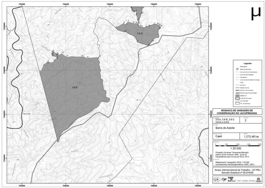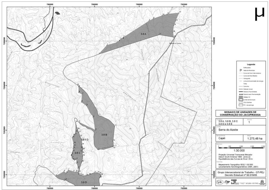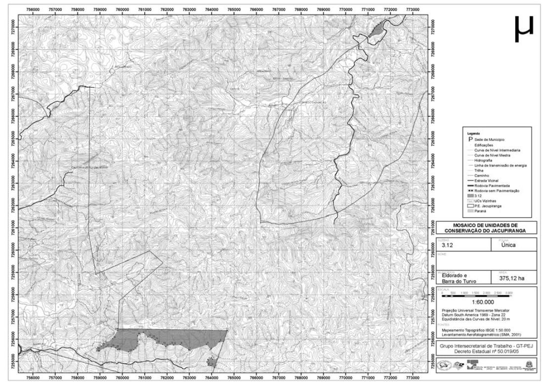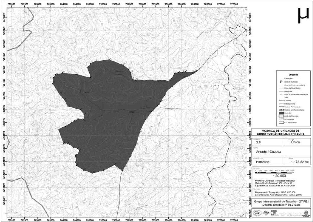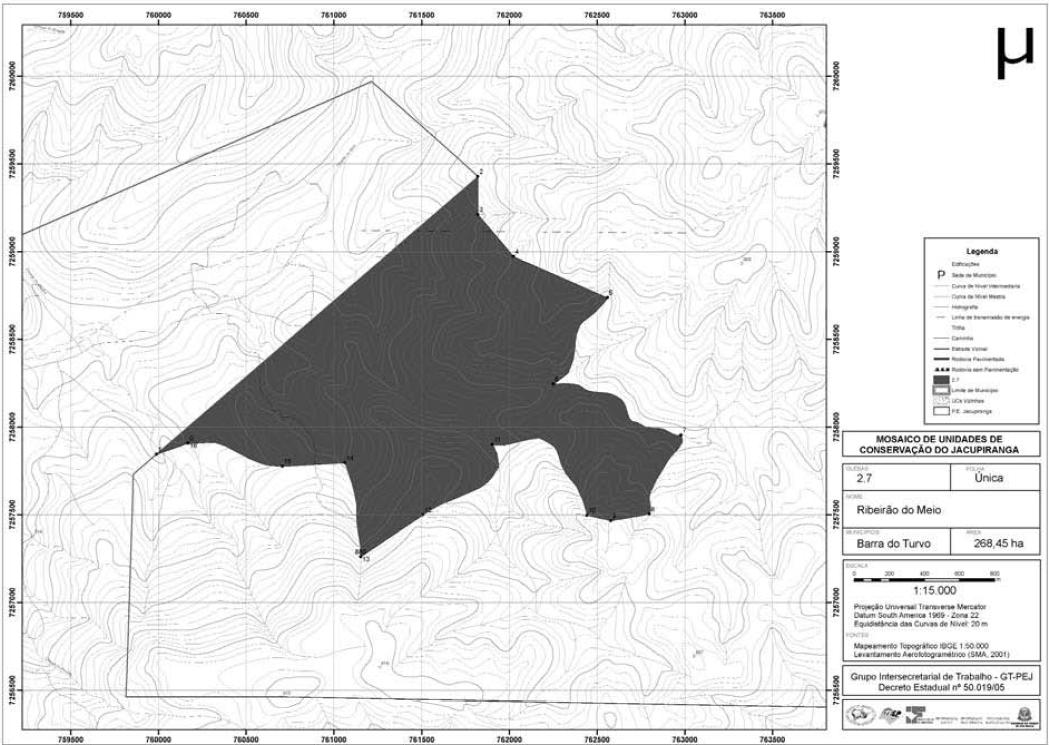 Do vértice 1 ,segue pela antiga divisa do Parque Estadual do Jacupiranga até o vértice 2,de coordenadas E=782.555,6947 m e N= 7.248.867,2423 m, do vértice 2 ,segue até o vértice 3,de coordenadas E= 782.530,7883 m e N=7.248.861,1994 m, do vértice 3 ,segue até o vértice 4,de coordenadas E= 782.530,7883 m e N= 7.248.715,0406 m, do vértice 4 ,segue até o vértice 5,de coordenadas E= 782.501,9411 m e N= 7.248.688,1166 m, do vértice 5 ,segue até o vértice 6,de coordenadas E= 782.498,0948 m e N= 7.248.653,5000 m, do vértice 6 ,segue até o vértice 7,de coordenadas E=782.463,4783 m e N= 7.248.626,5760 m, do vértice 7 ,segue até o vértice 8,de coordenadas E= 782.436,5543 m e N=7.248.595,8057 m, do vértice 8 ,segue até o vértice 9,de coordenadas E= 782.407,7071 m e N= 7.248.588,1131 m, do vértice 9 ,segue até o vértice 10,de coordenadas E= 782.409,6303 m e N= 7.248.641,9611 m, do vértice 10 ,segue até o vértice 11,de coordenadas E= 782.400,0146 m e N= 7.248.641,9611 m, do vértice 11 ,segue até o vértice 12,de coordenadas E=782.346,1666 m e N= 7.248.595,8057 m, do vértice 12 ,segue até o vértice 13,de coordenadas E= 782.284,6260 m e N=7.248.595,8057 m, do vértice 13 ,segue até o vértice 14,de coordenadas E= 782.271,1640 m e N= 7.248.615,0371 m, do vértice 14 ,segue até o vértice 15,de coordenadas E=782.255,7788 m e N= 7.248.605,4214 m, do vértice 15 ,segue até o vértice 16,de coordenadas E= 782.271,1640 m e N=7.248.586,1900 m, do vértice 16, segue até o vértice 17,de coordenadas E= 782.275,0103 m e N= 7.248.563,1123 m, do vértice 17 ,segue até o vértice 18,de coordenadas E= 782.290,3954 m e N= 7.248.530,4188 m, do vértice 18 ,segue até o vértice 19,de coordenadas E= 782.311,5500 m e N=7.248.507,3411 m, do vértice 19 ,segue até o vértice 20,de coordenadas E= 782.303,8574 m e N= 7.248.478,4940 m, do vértice 20 ,segue até o vértice 21,de coordenadas E=782.265,3946 m e N= 7.248.466,9551 m, do vértice 21 ,segue até o vértice 22,de coordenadas E= 782.242,3168 m e N=7.248.466,9551 m, do vértice 22 ,segue até o vértice 23,de coordenadas E= 782.242,3168 m e N= 7.248.453,4931 m, do vértice 23 ,segue até o vértice 24,de coordenadas E= 782.251,9326 m e N= 7.248.432,3386 m, do vértice 24 ,segue até o vértice 25,de coordenadas E= 782.268,5151 m e N=7.248.411,6818 m, do vértice 25 ,segue até o vértice 26,localizado em um afluente do Rio Jacupiranguinha de coordenadas E= 782.224,2414 m e N= 7.248.370,9849 m, do vértice 26 ,segue até o vértice 27,de coordenadas E= 782.348,0886 m e N= 7.248.016,0389 m, do vértice 27 ,segue até o vértice 28,de coordenadas E= 782.332,9661 m e N= 7.247.993,6482 m, do vértice 28 ,segue até o vértice 29,de coordenadas E=782.215,5522 m e N= 7.248.012,6782 m, do vértice 29 ,segue até o vértice 30,de coordenadas E= 782.072,7411 m e N=7.247.980,9547 m, do vértice 30 ,segue até o vértice 31,localizado no afluente do Rio Jacupiranguinha de coordenadas E=782.056,8711 m e N= 7.247.885,7391 m, do vértice 31 ,segue até o vértice 32,de coordenadas E= 782.161,6017 m e N=7.247.806,4118 m, do vértice 32 ,segue até o vértice 33,de coordenadas E= 782.196,5119 m e N= 7.247.720,7215 m, do vértice 33 ,segue até o vértice 34,de coordenadas E=782.272,6709 m e N= 7.247.676,2963 m, do vértice 34 ,segue até o vértice 35,de coordenadas E= 782.317,0961 m e N=7.247.587,4438 m, do vértice 35 ,segue até o vértice 36,de coordenadas E= 782.317,0961 m e N= 7.247.520,7916 m, do vértice 36 ,segue até o vértice 37,de coordenadas E=782.339,3128 m e N= 7.247.454,1497 m, do vértice 37 ,segue até o vértice 38,de coordenadas E= 782.333,3824 m e N=7.247.395,5742 m, do vértice 38 ,segue até o vértice 39, localizado em um curso d’agua de coordenadas E= 782.411,0092 m e N= 7.247.320,4604 m, do vértice 39 ,segue por este curso d’agua até o vértice 40,de coordenadas E= 782.247,8914 m e N= 7.247.127,2963 m, do vértice 40 ,segue até o vértice 41, de coordenadas E= 782.408,1753 m e N= 7.247.046,6219 m, do vértice 41 ,segue até o vértice 42,de coordenadas E=782.418,2402 m e N= 7.246.961,0706 m, do vértice 42 ,segue até o vértice 43,de coordenadas E= 782.227,0078 m e N=7.246.840,2922 m, do vértice 43 ,segue até o vértice 44,de coordenadas E= 782.211,9105 m e N= 7.246.467,8924 m, do vértice 44 ,segue até o vértice 45,de coordenadas E=782.136,4241 m e N= 7.246.326,9843 m, do vértice 45 ,segue até o vértice 46,de coordenadas E= 782.136,4241 m e N=7.246.231,3681 m, do vértice 46 ,segue até o vértice 47,de coordenadas E= 782.160,2940 m e N= 7.246.118,3809 m, do vértice 47, segue até o vértice 48,de coordenadas E=782.110,6147 m e N= 7.246.058,7592 m, do vértice 48 ,segue até o vértice 49,de coordenadas E= 782.110,6147 m e N=7.245.998,6791 m, do vértice 49 ,segue até o vértice 50,de coordenadas E= 782.160,6760 m e N= 7.245.838,4702 m, do vértice 50 ,segue até o vértice 51,de coordenadas E=782.070,5518 m e N= 7.245.758,3627 m, do vértice 51 ,segue até o vértice 52,localizado no Rio Grota Funda de coordenadas E= 782.110,6147 m e N= 7.245.648,2110 m, do vértice 52 ,segue até o vértice 53, localizado em um curso d’agua de coordenadas E= 782.360,0304 m e N= 7.245.231,0990 m, do vértice 53 ,segue até o vértice 54,localizado em um curso d’agua de coordenadas E= 782.589,4909 m e N= 7.245.034,3268 m, do vértice 54 ,segue por este curso d’agua até o vértice 55, localizado no Rio do Braço Feio de coordenadas E= 782.199,4979 m e N= 7.245.033,0659 m, do vértice 55 ,segue por um curso d’agua até o vértice 56,de coordenadas E= 782.062,0939 m e N= 7.244.418,3711 m, do vértice 56 ,segue até o vértice 57,de coordenadas E= 781.860,8366 m e N= 7.244.627,9118 m, do vértice 57 ,segue até o vértice 58,de coordenadas E=781.585,2433 m e N= 7.244.705,9098 m, do vértice 58 ,segue até o vértice 59, localizado em um curso d’agua de coordenadas E= 781.335,1701 m e N= 7.244.690,9038 m, do v