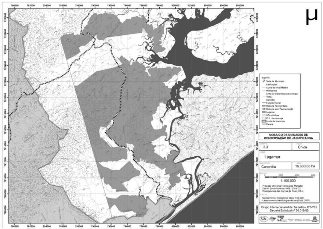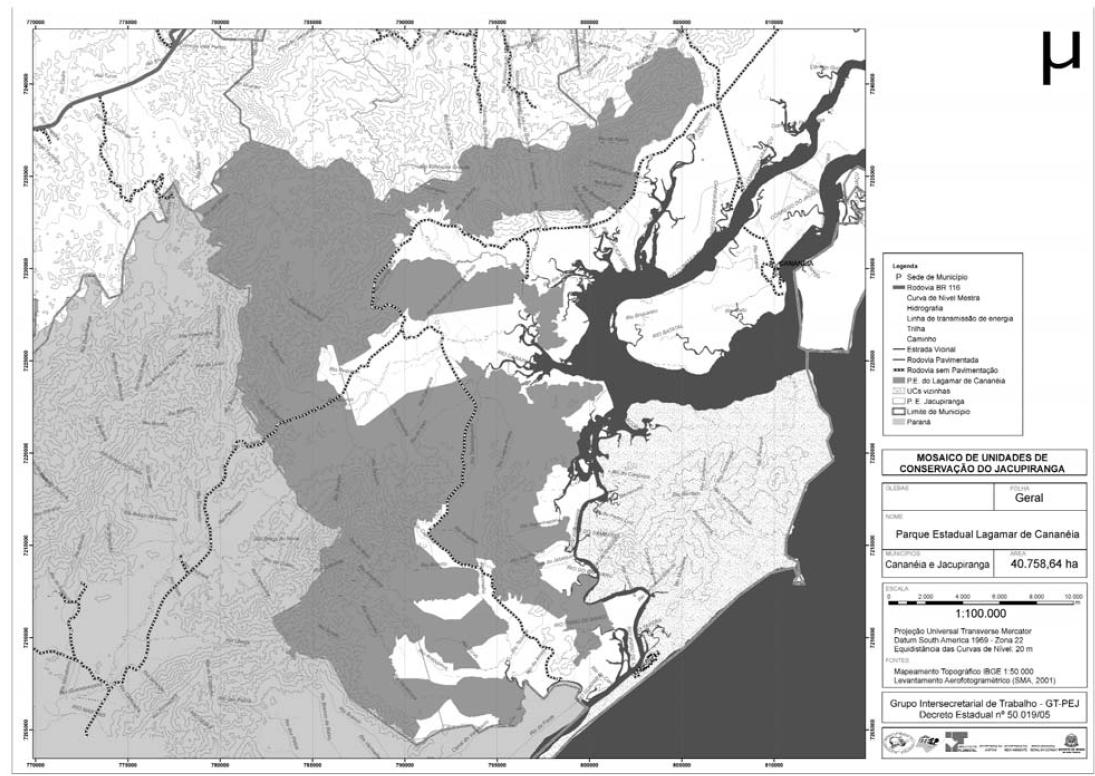 III - Parque Estadual do Lagamar de Cananéia, com área de 40.758,64 ha (quarenta mil setecentos e cinqüenta e oito hectares e sessenta e quatro ares), inserido nos Municípios de Cananéia e Jacupiranga, cujos limites e confrontações encontram-se descritos no Anexo 6;