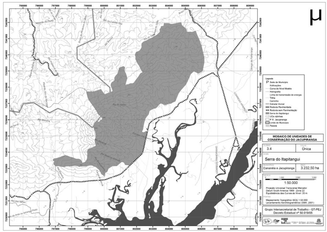 IV - gleba nº 3.4, conhecida como Serra do Itapitangui, localizada nos Municípios de Cananéia e Jacupiranga, com área de 3.232,50 ha (três mil duzentos e trinta e dois hectares e cinqüenta ares);