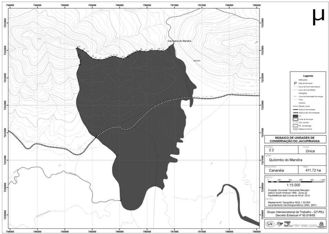 II - gleba nº 2.2, inserida no território do Quilombo de Mandira, localizada no Município de Cananéia, com área de 411,73 ha (quatrocentos e onze hectares e setenta e três ares), que fica reservada para a regularização fundiária daquela comunidade quilombola;