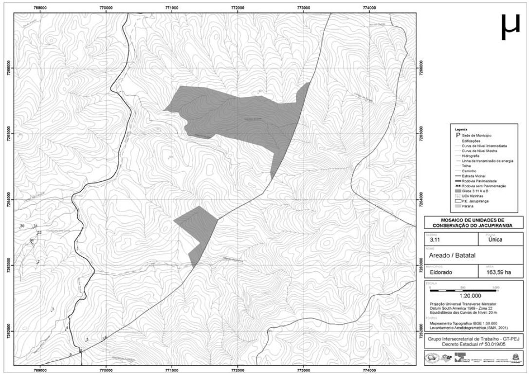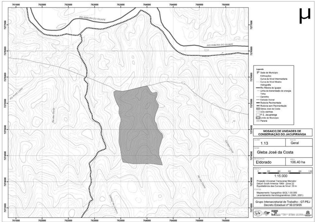 A referida gleba está Geo-referenciada com base nas cartas digitais IBGE escala 1:50.000 Sistema U T M - Datum SAD-69, localizada nos Municípios de Cajatí e Barra do Turvo, cuja descrição inicia-se no vértice 1 localizado no Rio Cedro de coordenadas Este 775.476,5357 m e Norte 7.243.376,3115 m.