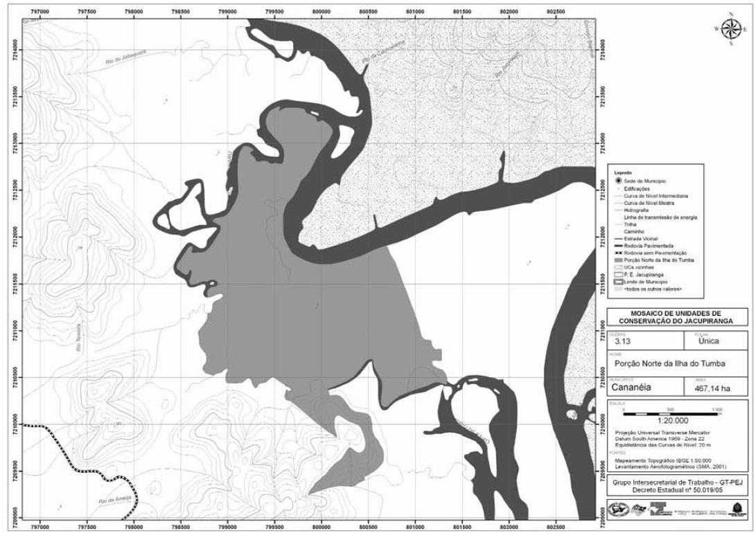A referida gleba está Geo-referenciada com base nas cartas digitais IBGE escala 1:50.000 Sistema U T M - Datum SAD-69, localizada no município de Cananéia, cuja descrição inicia-se no vértice 1 localizada na confluência das margens do Rio do Capivarú com o Canal do Ararapira de coordenadas Este 795942,92 m e Norte 7228673,68m