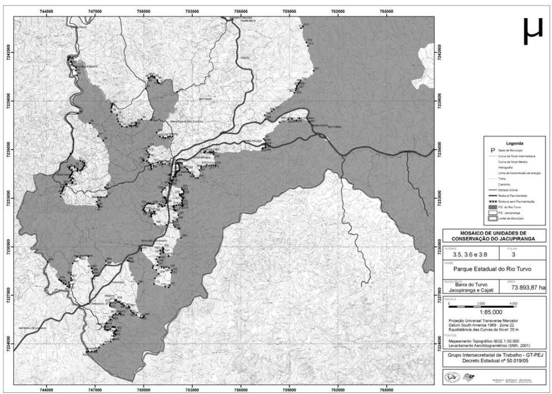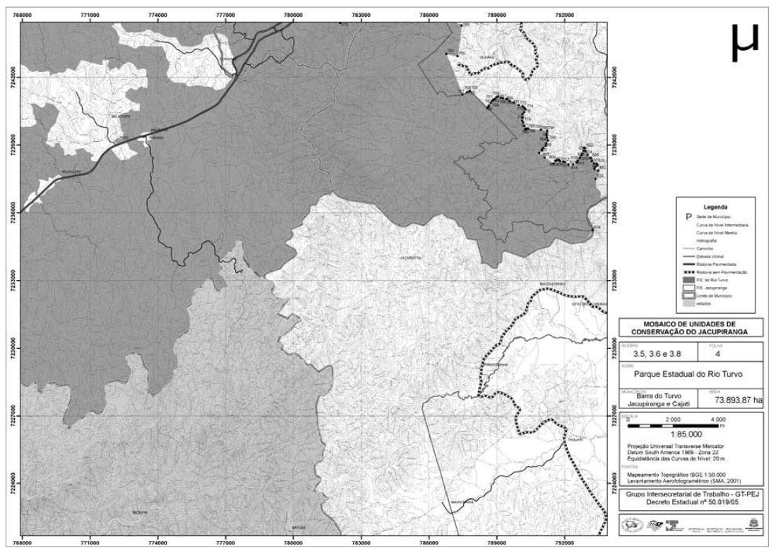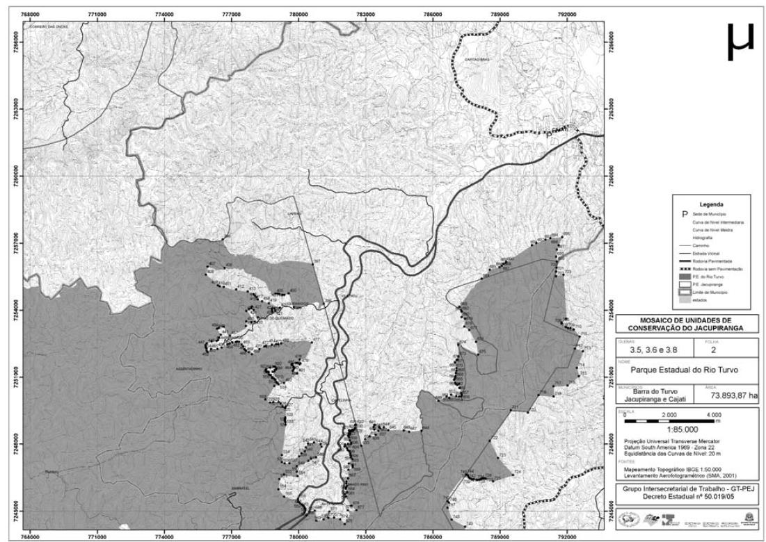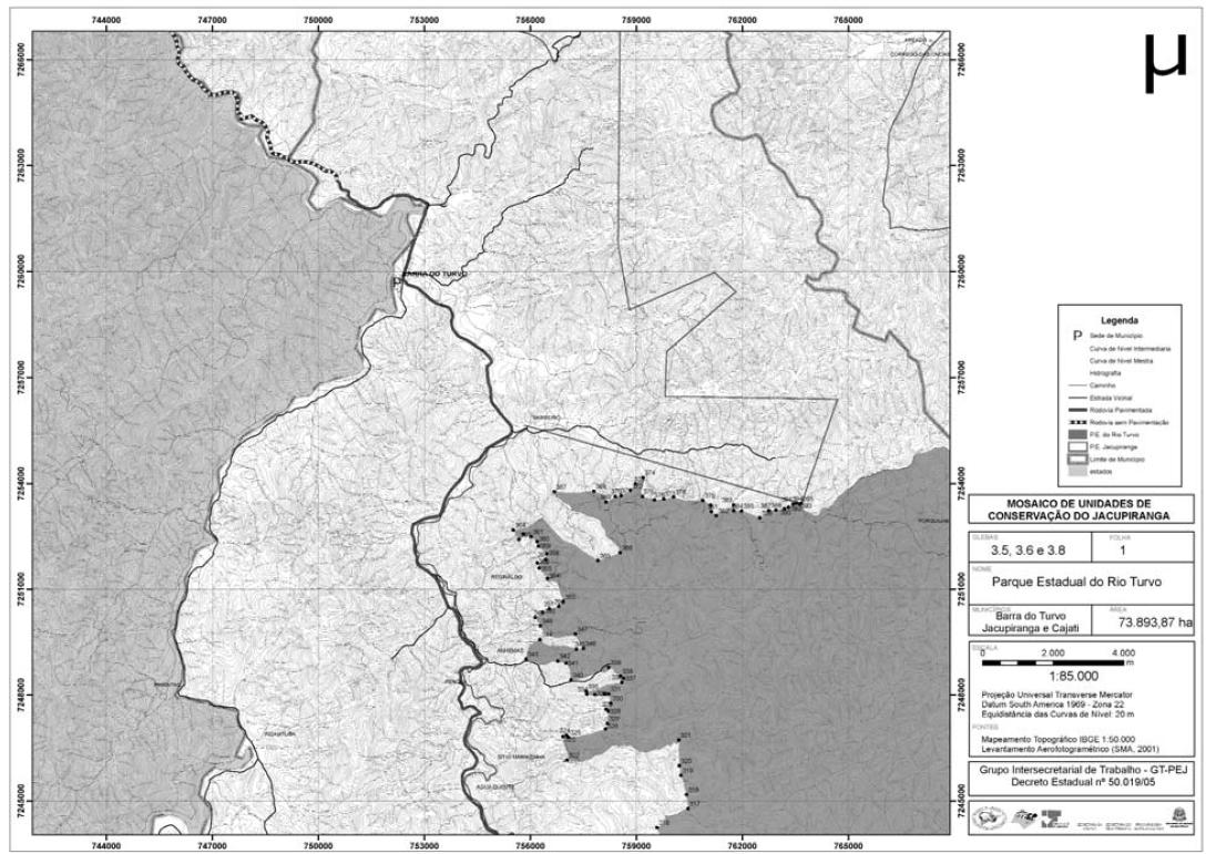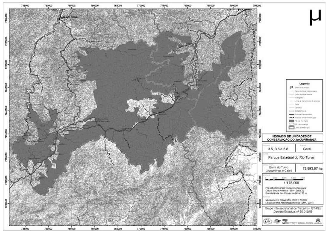 II - Parque Estadual do Rio Turvo, com área de 73.893,87 ha (setenta e três mil oitocentos e noventa e três hectares e oitenta e sete ares), inserido nos Municípios de Barra do Turvo, Cajati e Jacupiranga, cujos limites e confrontações encontram-se descritos no Anexo 5;
