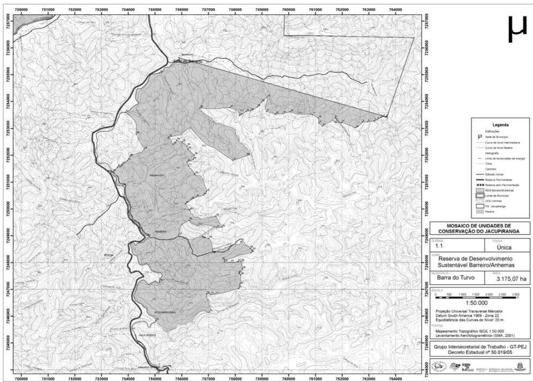 I - Reserva de Desenvolvimento Sustentável - RDS Barreiro/Anhemas, destinada às comunidades tradicionais da região Barreiro/Anhemas, com área de 3.175,07 ha (três mil cento e setenta e cinco hectares e sete ares), inserida no Município de Barra do Turvo, cujos limites e confrontações encontram-se descritos no Anexo 7;