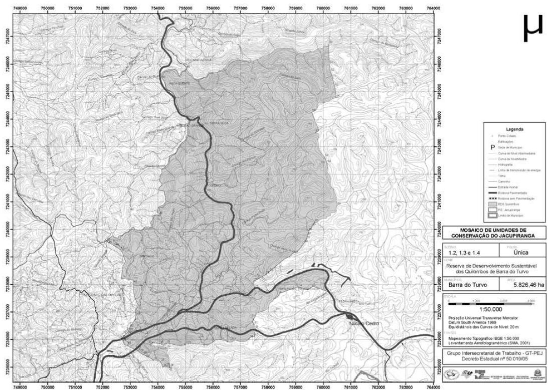 II - Reserva de Desenvolvimento Sustentável - RDS dos Quilombos de Barra do Turvo, com área total de 5.826,46 ha (cinco mil oitocentos e vinte seis hectares e quarenta e seis ares), destinada às comunidades quilombolas de Ribeirão Grande/Terra Seca, Cedro e Pedra Preta, inserida no Município de Barra do Turvo, cujos limites e confrontações encontram-se descritos no Anexo 8;