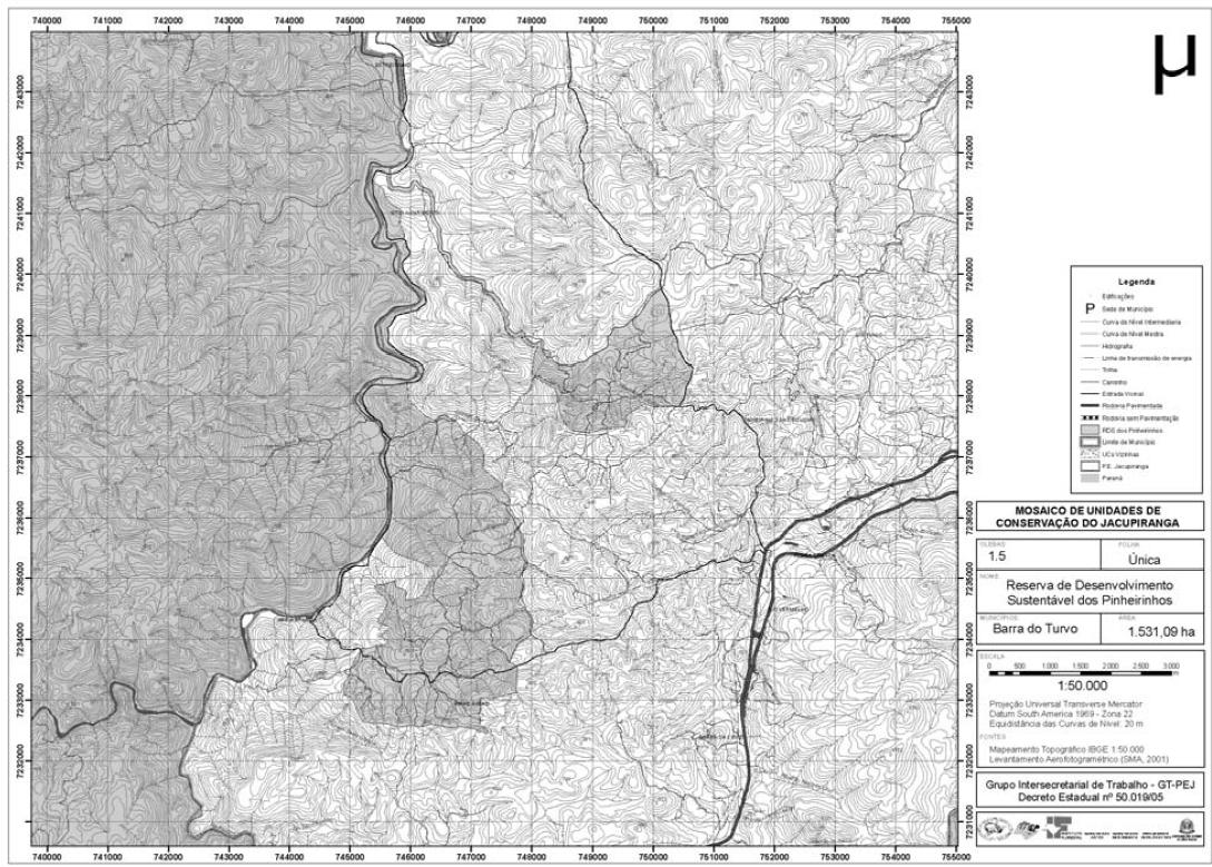 III - Reserva de Desenvolvimento Sustentável - RDS dos Pinheirinhos, destinada às comunidades tradicionais de Pinheirinho do Franco, Areia Branca e Pinheirinho das Dúvidas, com área de 1.531,09 ha (mil quinhentos e trinta e um hectares e nove ares), inserida no Município de Barra do Turvo, cujos limites e confrontações encontram-se descritos no Anexo 9;