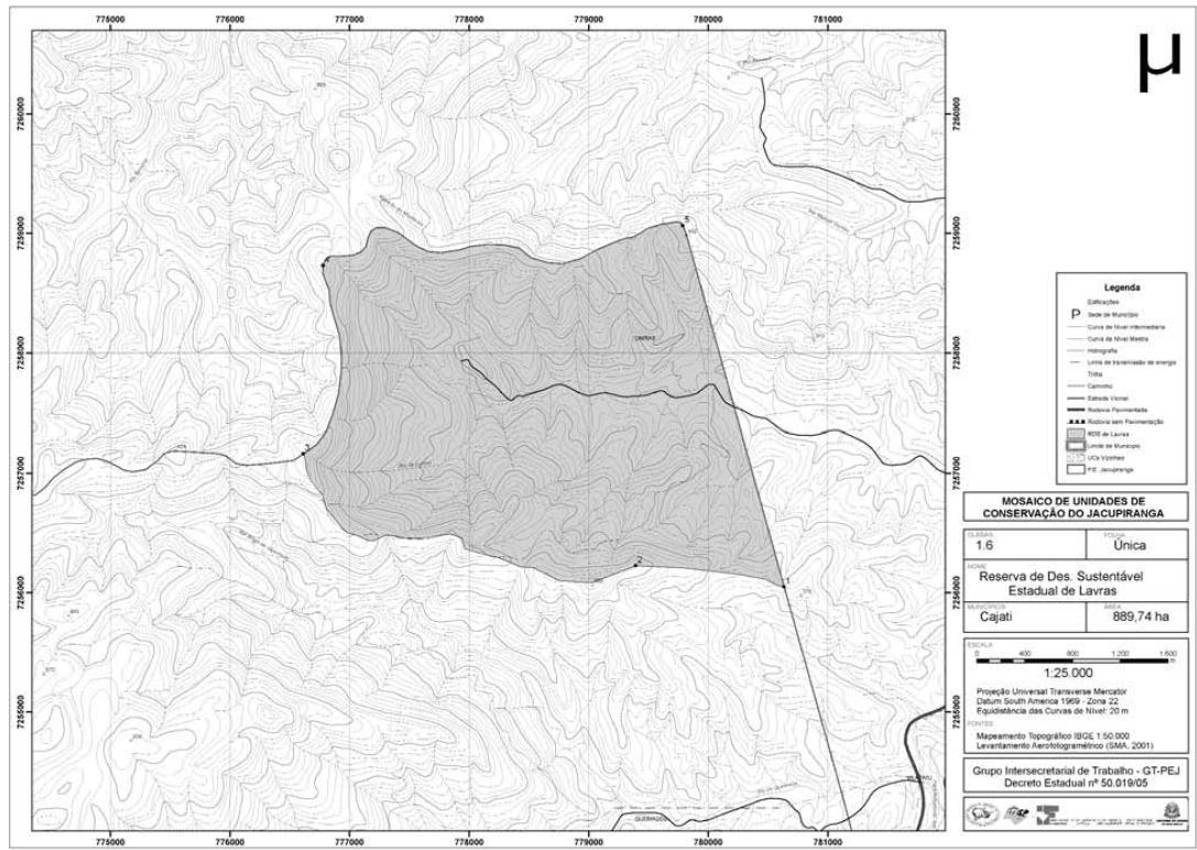 IV - Reserva de Desenvolvimento Sustentável - RDS de Lavras, com área destinada aos moradores tradicionais da própria área e outros oriundos de remanejamentos do Parque Estadual do Rio Turvo, com área de 889,74 ha (oitocentos e oitenta e nove hectares e setenta e quatro ares), inserida no Município de Cajati, cujos limites e confrontações encontram-se descritos no Anexo 10;