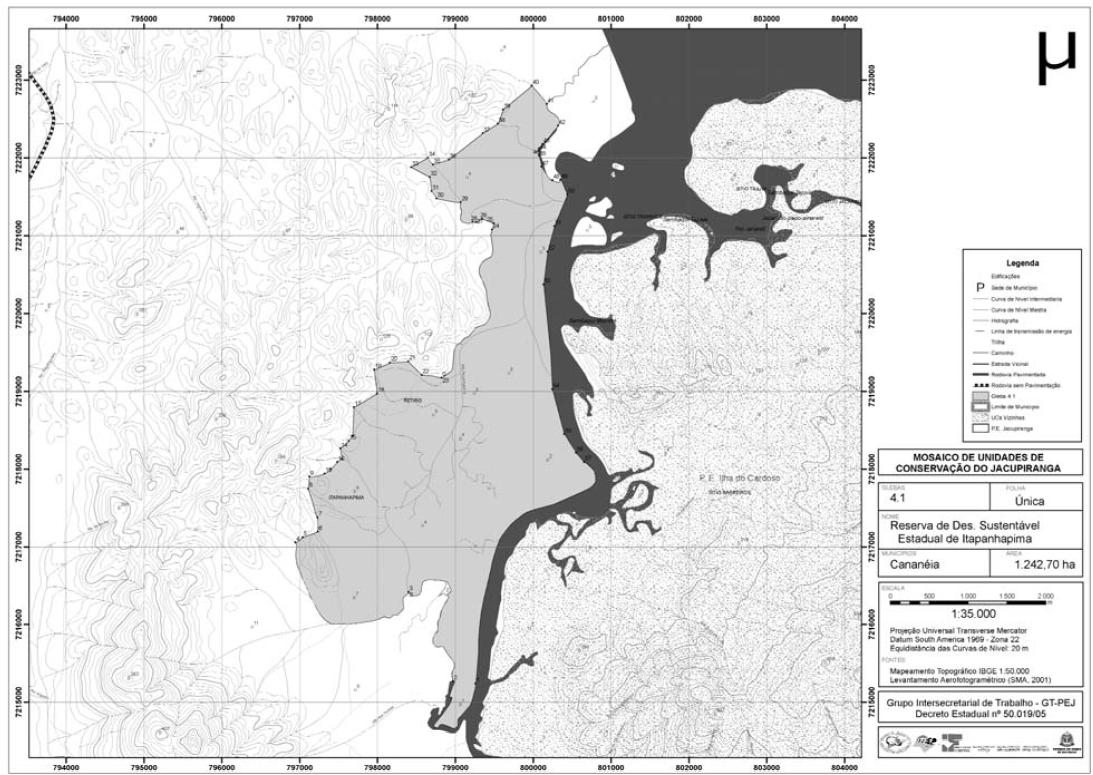 V - Reserva de Desenvolvimento Sustentável - RDS de Itapanhapima, destinada à população tradicional de Itapanhapima, Retiro, Bombicho e outras oriundas de realocação do Parque Estadual Lagamar de Cananéia, e aos pescadores artesanais de Cananéia com área de 1.242,70 ha (mil duzentos e quarenta e dois hectares e setenta ares), localizada no Município de Cananéia, cujos limites e confrontações encontram-se descritos no Anexo 11;