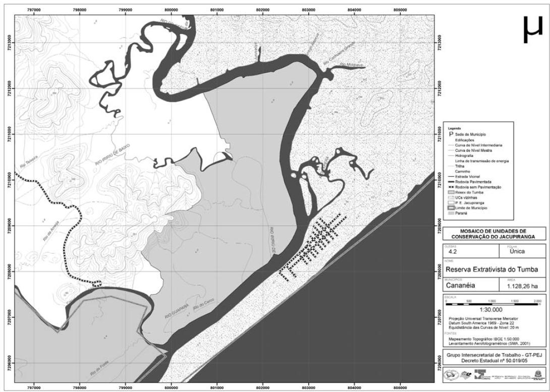 Artigo 7º - Fica instituída a Reserva Extrativista - RESEX da Ilha do Tumba, destinada às comunidades da Ilha do Cardoso e Região de Ariri, com área de 1.128,26 ha (um mil, cento e vinte e oito hectares e vinte e seis ares), em área correspondente à gleba n.º 4.2, inserida no Município de Cananéia, cujos limites e confrontações encontram-se descritos no Anexo 12.