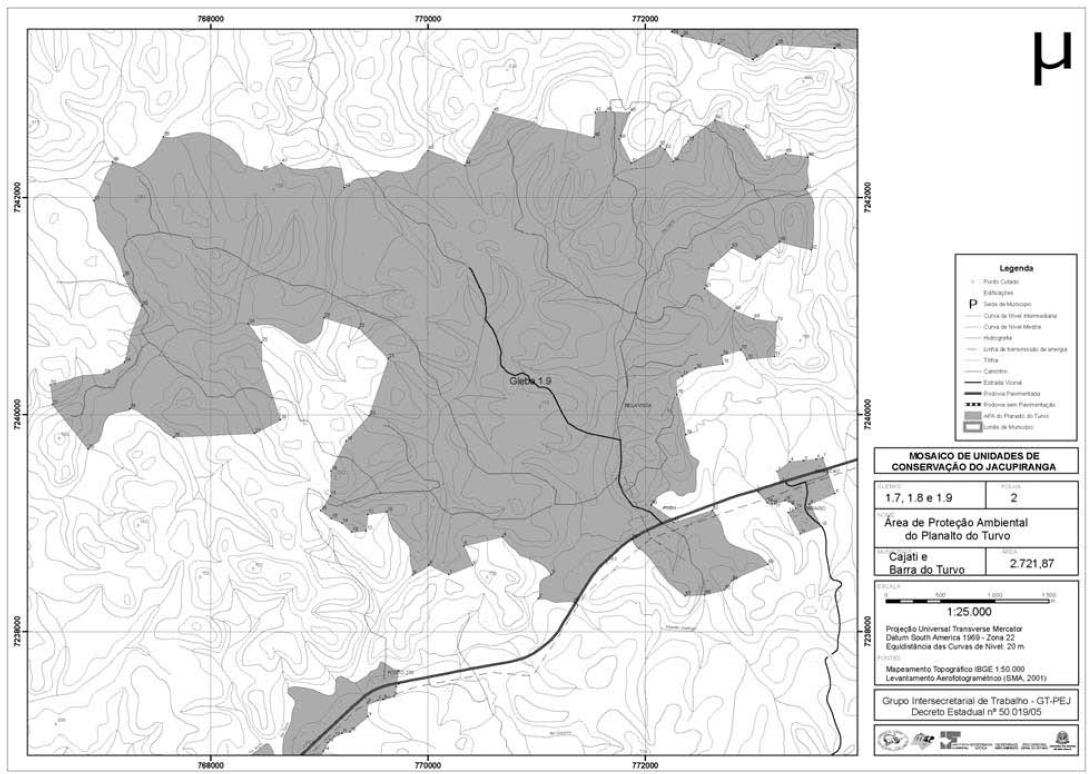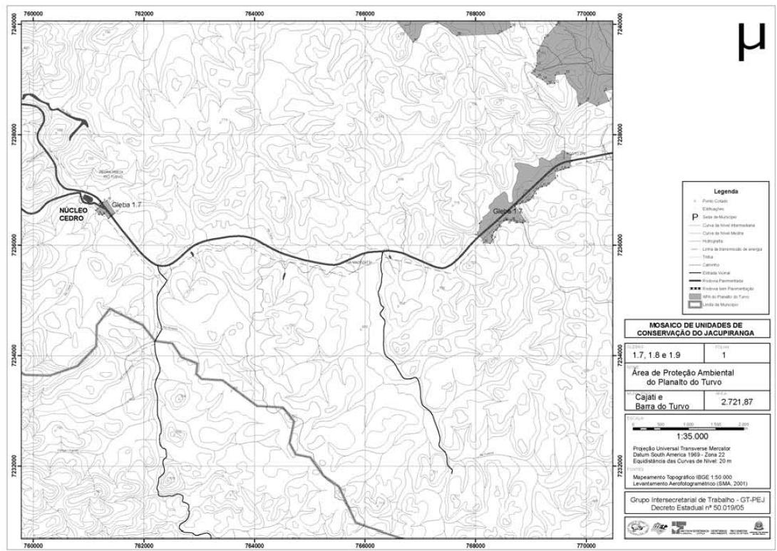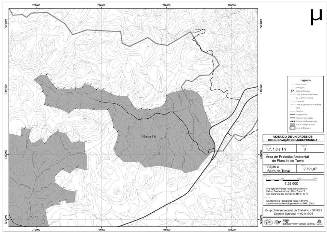 V - gleba nº 1.7, composta pelas áreas A, B e C; glebas 1.8 e 1.9, conhecidas como Paraíso, Conchas, Quilômetro 270 (duzentos e setenta) e Bela Vista, situadas ao longo da BR-116, abrangidas pelos Municípios de Barra do Turvo e Cajati, com áreas de 114,59 ha (cento e catorze hectares e cinqüenta e nove ares), de 743,20 ha (setecentos e quarenta e três hectares e vinte ares) e de 1.864,08 ha (mil oitocentos e sessenta e quatro hectares e oito ares), respectivamente, somando um total de 2.721,87 ha (dois mil setecentos e vinte um hectares e oitenta e sete ares), que passam a compor a Área de Proteção Ambiental - APA do Planalto do Turvo, nos termos do inciso I do artigo 10 desta lei.