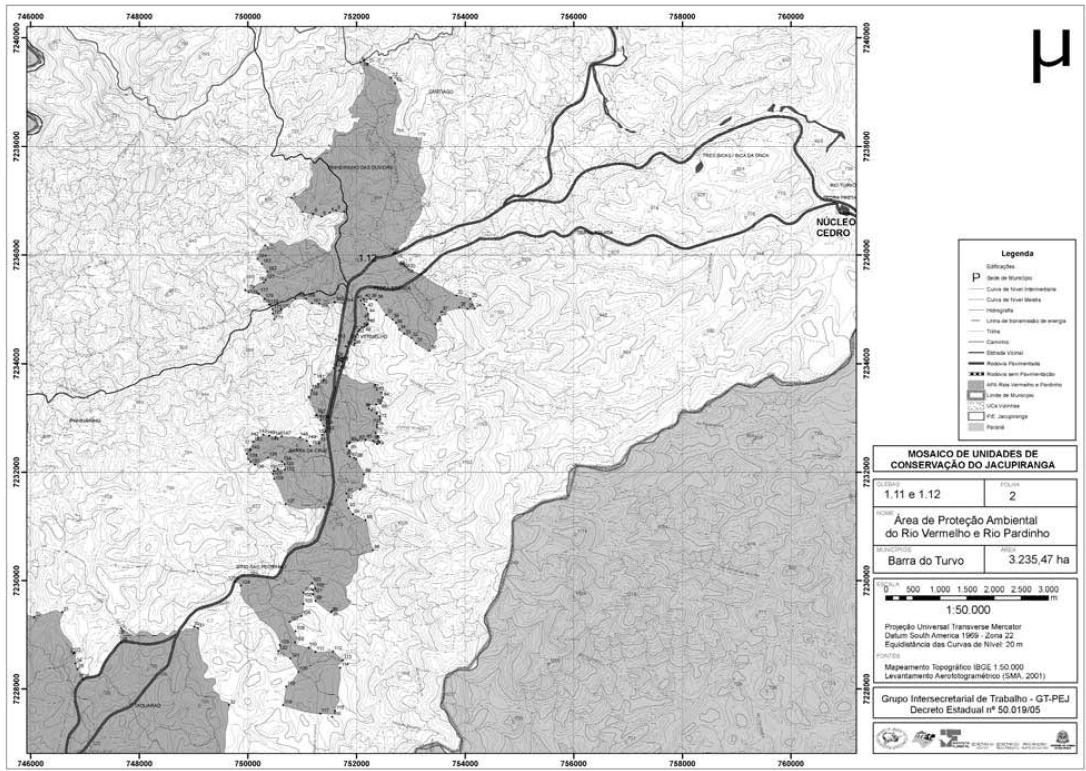 Do vértice 1 ,segue até o vértice 2, localizado na confluência do Rio Pardinho com o Corrêgo Araçaieiro,de coordenadas E= 744.083,0000 m e N= 7.229.071,0000 m, do vértice 2, segue até o vértice 3, localizado no afluente do Córrego Araçaieiro de coordenadas E= 744.777,0000 m e N=7.227.967,0000 m, do vértice 3 ,segue até o vértice 4,de coordenadas E= 744.863,8209 m e N= 7.227.917,9008 m, do vértice 4 ,segue até o vértice 5,de coordenadas E= 744.934,7923 m e N= 7.227.846,9294 m, do vértice 5, segue até o vértice 6,de coordenadas E= 745.053,0725 m e N= 7.227.768,0814 m, do vértice 6 ,segue até o vértice 7,de coordenadas E=745.171,3527 m e N= 7.227.673,4515 m, do vértice 7 ,segue até o vértice 8,de coordenadas E= 745.281,7440 m e N=7.227.539,4018 m, do vértice 8 ,segue até o vértice 9,de coordenadas E= 745.384,2505 m e N= 7.227.507,8626 m, do vértice 9 ,segue até o vértice 10,de coordenadas E= 745.431,5716 m e N= 7.227.523,6322 m, do vértice 10 ,segue até o vértice 11,de coordenadas E= 745.431,5716 m e N= 7.227.626,1427 m, do vértice 11 ,segue até o vértice 12, localizado no afluente do Córrego Araçaieiro de coordenadas E= 745.393,1056 m e N= 7.227.792,7686 m, do vértice 12 ,segue até o vértice 13,de coordenadas E= 745.567,8902 m e N= 7.227.918,0512 m, do vértice 13 ,segue até o vértice 14,de coordenadas E=745.573,5021 m e N= 7.227.949,4400 m, do vértice 14 ,segue até o vértice 15,de coordenadas E= 745.522,9329 m e N=7.228.071,8613 m, do vértice 15 ,segue até o vértice 16,de coordenadas E= 745.516,4489 m e N= 7.228.259,9025 m, do vértice 16 ,segue até o vértice 17,de coordenadas E=745.548,8687 m e N= 7.228.519,2694 m, do vértice 17 ,segue até o vértice 18, localizado no topo do morro de coordenadas E= 745.613,7105 m e N= 7.228.966,6775 m, do vértice 18 ,segue até o vértice 19,de coordenadas E= 745.899,0133 m e N= 7.229.381,6638 m, do vértice 19 ,segue até o vértice 20, localizado no Rio São Pedrinho de coordenadas E=746.067,9999 m e N= 7.229.324,8994 m, do vértice 20 ,segue pelo referido rio até o vértice 21,de coordenadas E=746.587,5708 m e N= 7.229.415,3278 m, do vértice 21, segue até o vértice 22, localizado no afluente do Rio São Pedrinho de coordenadas E= 746.780,5961 m e N= 7.228.656,7276 m, do vértice 22 ,segue até o vértice 23,de coordenadas E=746.811,5222 m e N= 7.228.667,0101 m, do vértice 23 ,segue até o vértice 24,de coordenadas E= 746.827,2918 m e N=7.228.469,8819 m, do vértice 24, segue até o vértice 25,de coordenadas E= 746.866,7117 m e N= 7.228.367,3713 m, do vértice 25 ,segue até o vértice 26,de coordenadas E=746.961,3416 m e N= 7.228.193,8893 m, do vértice 26 ,segue até o vértice 27, localizado na BR 116 de coordenadas E= 746.963,0000 m e N= 7.228.180,0000 m, do vértice 27 ,segue pela BR 116 no sentido São Paulo, até o vértice 28, localizado no afluente do Rio São Pedrinho de coordenadas E=747.667,9128 m e N= 7.228.864,3767 m, do vértice 28 ,segue até o vértice 29, localizado no Rio São Pedrinho de coordenadas E= 747.671,2058 m e N= 7.229.120,8312 m, do vértice 29 ,segue até o vértice 30, localizado na confluência do Rio São Pedrinho com o Ribeirão do Aleixo de coordenadas E= 749.014,5023 m e N= 7.229.149,0551 m, do vértice 30 ,segue até o vértice 31, localizado na confluência do Rio São Pedrinho com o Ribeirão Palmital de coordenadas E= 749.086,5156 m e N= 7.229.120,7246 m, do vértice 31 ,segue até o vértice 32, localizado no Ribeirão Palmital de coordenadas E=749.658,0000 m e N= 7.227.705,0000 m, do vértice 32 ,segue até o vértice 33, localizado no afluente do Ribeirão Palmital de coordenadas E= 750.029,1209 m e N= 7.225.692,2337 m, do vértice 33 ,segue até o vértice 34,de coordenadas E=749.954,0430 m e N= 7.225.632,5499 m, do vértice 34 ,segue até o vértice 35,de coordenadas E= 749.814,7626 m e N=7.225.618,6317 m, do vértice 35 ,segue até o vértice 36, localizado no afluente do Ribeirão Barra Grande de coordenadas E= 749.552,7088 m e N= 7.225.778,4147 m, do vértice 36 ,segue até o vértice 37, localizado no afluente do Ribeirão Barra Grande de coordenadas E= 749.407,0000 m e N=7.225.884,0000 m, do vértice 37 ,segue até o vértice 38,de coordenadas E= 749.313,3631 m e N= 7.225.925,0412 m, do vértice 38 ,segue até o vértice 39,de coordenadas E=749.215,8619 m e N= 7.226.050,3911 m, do vértice 39 ,segue até o vértice 40,de coordenadas E= 749.146,2340 m e N=7.226.245,3811 m, do vértice 40 ,segue até o vértice 41, localizado no topo do morro de coordenadas E= 749.076,5938 m e N= 7.226.287,1603 m, do vértice 41 ,segue até o vértice 42,de coordenadas E= 748.798,0330 m e N= 7.226.370,7310 m, do vértice 42 ,segue até o vértice 43,de coordenadas E=748.700,5400 m e N= 7.226.440,3589 m, do vértice 43 ,segue até o vértice 44,de coordenadas E= 748.603,0430 m e N=7.226.468,2199 m, do vértice 44 ,segue até o vértice 45,de coordenadas E= 748.519,4723 m e N= 7.226.565,7211 m, do vértice 45 ,segue até o vértice 46,de coordenadas E=748.421,9834 m e N= 7.226.593,5698 m, do vértice 46 ,segue até o vértice 47,de coordenadas E= 748.310,5640 m e N=7.226.718,9197 m, do vértice 47 ,segue até o vértice 48,de coordenadas E= 748.268,7725 m e N= 7.226.704,9892 m, do vértice 48 ,segue até o vértice 49,de coordenadas E=748.240,9238 m e N= 7.226.663,2100 m, do vértice 49 ,segue até o vértice 50,de coordenadas E= 747.948,4407 m e N=7.226.537,8601 m, do vértice 50, segue até o vértice 51,de coordenadas E= 747.914,0891 m e N= 7.226.427,0679 m, do vértice 51 ,segue até o vértice 52, localizado no Ribeirão Barra Grande de coordenadas E= 747.923,2111 m e N=7.226.336,0352 m, do vértice 52 ,segue pelo referido ribeirão até o vértice 53,de coordenadas E= 748.576,2883 m e N=7.225.857,9543 m, do vértice 53 ,segue até o vértice 54,de coordenadas E= 748.561,2638 m e N= 7.225.841,4705 m, do vértice 54 ,segue até o vértice 55,de coordenadas