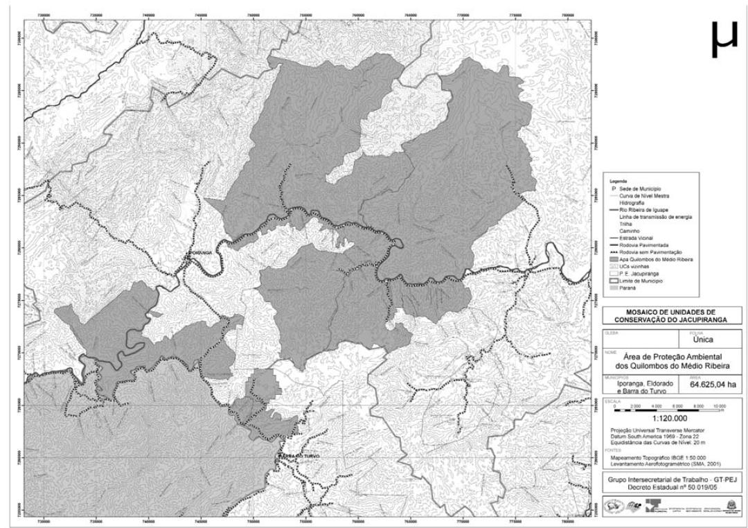 A Área de Proteção Ambiemtal dos Quilombos do Médio Ribeira, é composta por 3 setores, localizados nos Municípios de Barra do Turvo, Eldorado e Iporanga, que assim descreve-se: