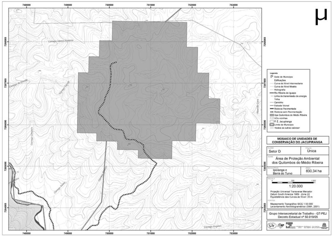 IV - Área de Proteção Ambiental - APA dos Quilombos do Médio Ribeira, localizada nos Municípios de Iporanga, Barra do Turvo e Eldorado, composta pelos territórios das comunidades Quilombolas de Nhunguara, André Lopes, Sapatu, Ivaporanduva, Galvão, São Pedro, Pilões, Maria Rosa, Pedro Cubas, Pedro Cubas de Cima e Praia Grande, com área de 64.625,04 ha (sessenta e quatro mil seiscentos e vinte e cinco hectares e quatro ares), originalmente incluída na APA da Serra do Mar, instituída pelo Decreto estadual nº 22.717, de 21 de setembro de 1984, alterado pelos Decretos nº 28.347 e nº 28.348, ambos de 22 de abril de 1988, e ora desmembrada desta última área, e outras áreas especificadas, com limites e confrontações descritos no Anexo 16.