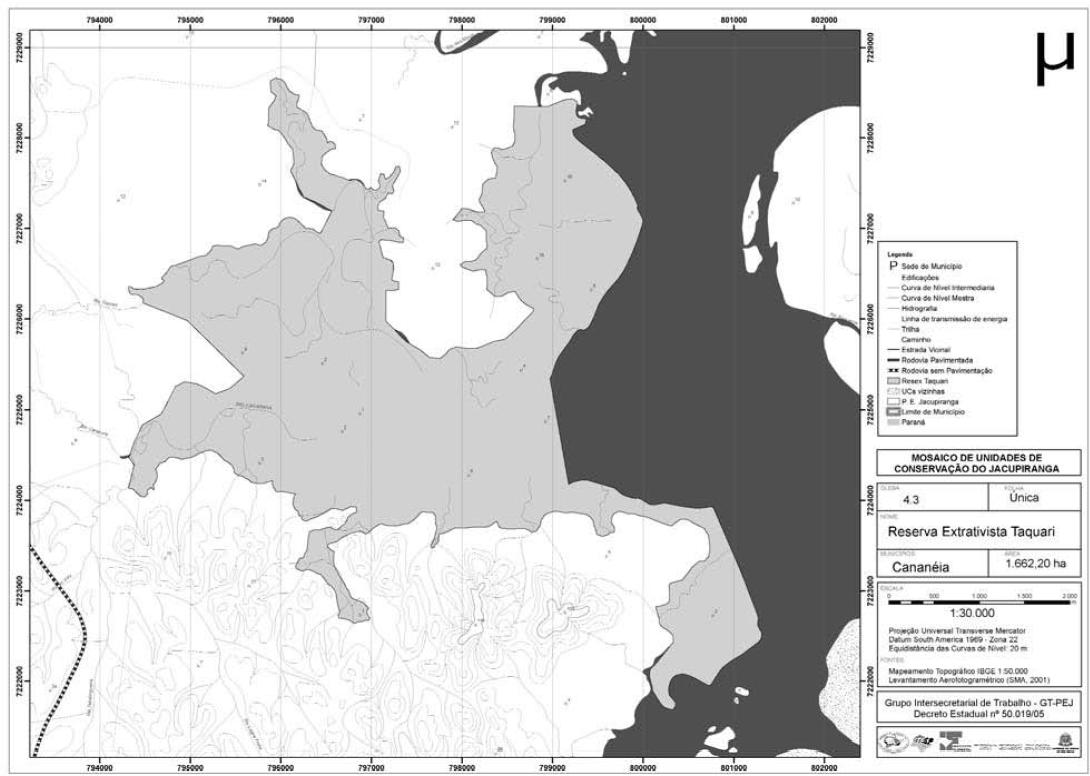 Artigo 8º - Fica instituída a Reserva Extrativista - RESEX Taquari, destinada às comunidades locais e aos pescadores artesanais de Cananéia, com área de 1.662,20 ha (mil seiscentos e sessenta e dois hectares e vinte ares), no Município de Cananéia, em área correspondente a gleba nº 4.3, originada do desmembramento da Gleba 3.3 do Anexo 3, cujos limites e confrontações encontram-se descritos no Anexo 17.