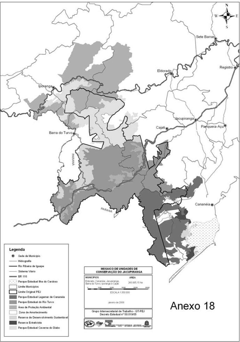 Artigo 12 - Fica instituído o Mosaico de Unidades de Conservação do Jacupiranga, com área total de 243.885,78 ha (duzentos e quarenta e três mil, oitocentos e oitenta e cinco hectares e setenta e oito ares), composto pelas unidades de conservação da natureza estabelecidas por esta lei, incluídas as áreas definidas como Zonas de Amortecimento e outras especificadas nos termos da planta cartográfica que compõe o Anexo 18.