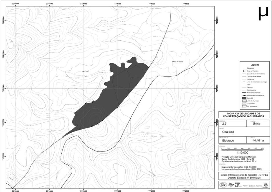 IX - gleba n( 2.9, na região conhecida como Cruz Alta, no Município de Eldorado, com área de 44,46 ha (quarenta e quatro hectares e quarenta e seis ares), que passa a compor a Zona de Amortecimento do Parque Estadual Caverna do Diabo, instituído nos termos do inciso I do artigo 5º desta lei;