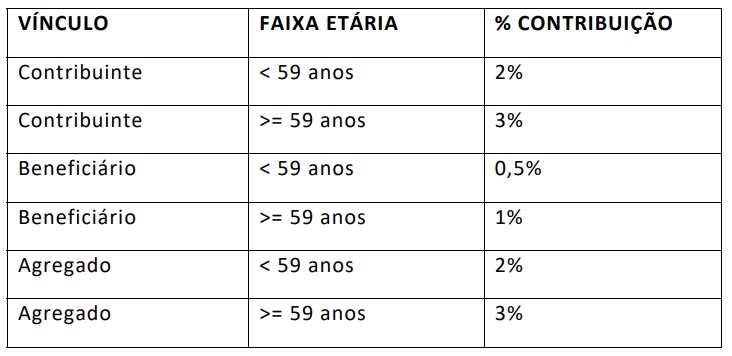 § 1° - Ao contribuinte que fizer a inscrição de beneficiários será acrescida a contribuição de 0,5% (meio por cento) ou 1,0% (um por cento) por beneficiário, incidente conforme tabela constante no § 2°, sobre a retribuição total mensal.